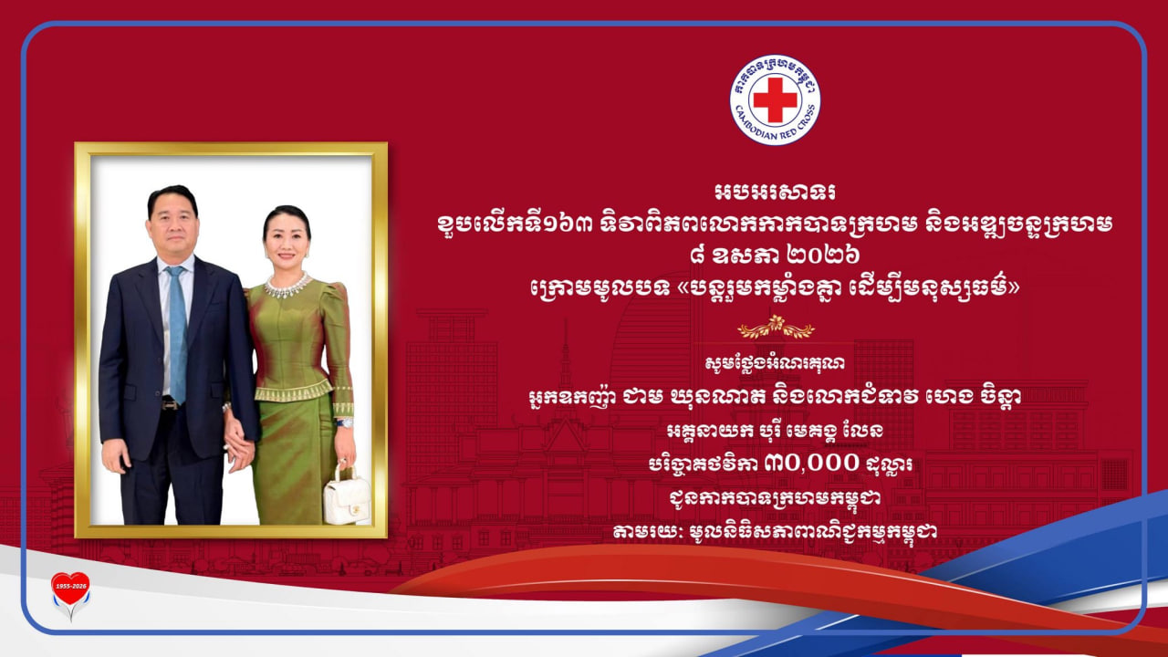 សម្តេចកិត្តិព្រឹទ្ធបណ្ឌិត ប៊ុន រ៉ានី ហ៊ុនសែន ប្រធានកាកបាទ ក្រហមកម្ពុជា សូមថ្លែងអំណរគុណយ៉ាងជ្រាលជ្រៅបំផុតចំពោះ អ្នកឧកញ៉ា ជាម ឃុនណាត អគ្គនាយក បុរី មេគង្គ លែន និង លោកជំទាវ ហេង ចិន្តា ដែលបានឧបត្ថម្ភថវិកា ៣ម៉ឺនដុល្លារអាមេរិក ជូនកាកបាទក្រហមកម្ពុជា ក្នុងឱកាសខួបលើកទី១៦៣ ទិវាពិភពលោក កាកបាទក្រហម និងអឌ្ឍចន្ទក្រហម ៨ ឧសភា ឆ្នាំ២០២៦ ក្រោមមូលបទ «បន្តរួមកម្លាំងគ្នា ដើម្បីមនុស្សធម៌»។
