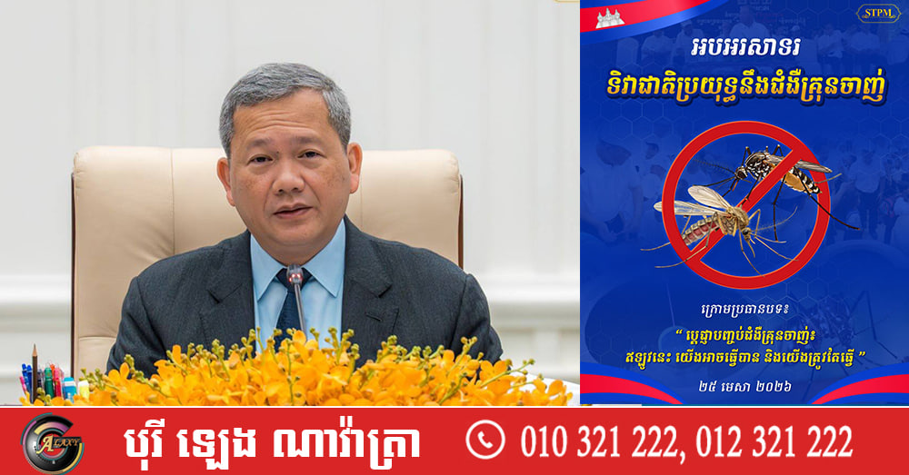 (ភ្នំពេញ)៖ សម្តេចបវរធិបតី ហ៊ុន ម៉ាណែត នាយករដ្ឋមន្ត្រីនៃកម្ពុជា នៅព្រឹកថ្ងៃទី២៥ ខែមេសា ឆ្នាំ២០២៦នេះ បានអបអរសាទរ ទិវាជាតិប្រយុទ្ធនឹងជំងឺគ្រុនចាញ់ ក្រោមប្រធានបទ «ប្តេជ្ញាបញ្ចប់ជំងឺគ្រុនចាញ់៖ ឥឡូវនេះ យើងអាចធ្វើបាន និងយើងត្រូវតែធ្វើ»។