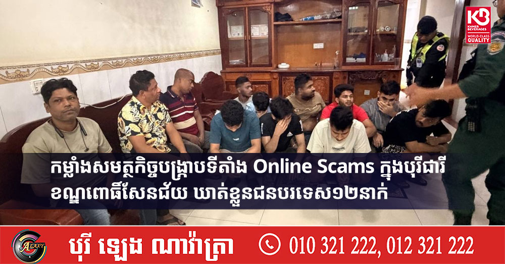 កម្លាំងសមត្ថកិច្ចបង្ក្រាបទីតាំង Online Scams ក្នុងបុរីជារី ខណ្ឌពោធិ៍សែនជ័យ ឃាត់ខ្លួនជនបរទេស១២នាក់