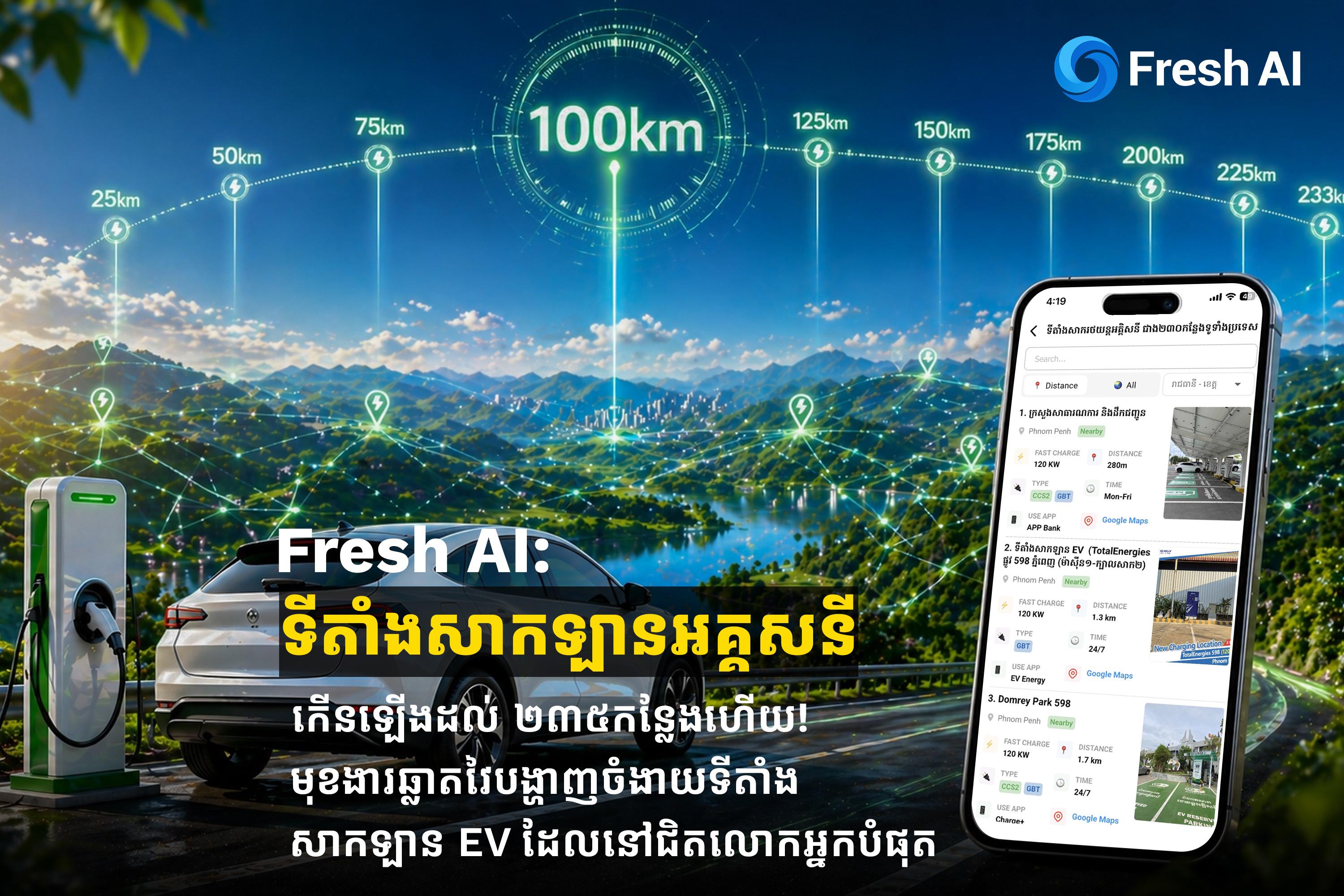 ជិះរថយន្ត EV ទៅខេត្តលែងបារម្ភហើយ ជាមួយមុខងារ EV Zone របស់ Fresh AI ទីតាំងសាកថ្មកើនដល់ ២៣៥កន្លែងទូទាំងប្រទេសកម្ពុជា