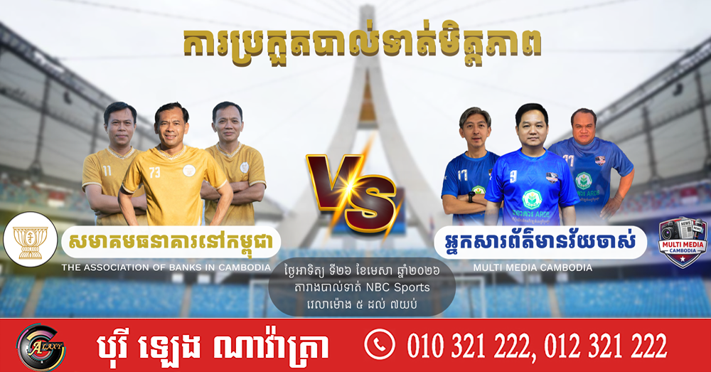 (ភ្នំពេញ)៖ ល្ងាចថ្ងៃទី២៦ ខែមេសា ឆ្នាំ២០២៦ស្អែកនេះ ក្រុមអ្នកសារព័ត៌មានកម្ពុជា នឹងប្រកួតបាល់ទាត់មិត្តភាពជាមួយ ក្រុមបាល់ទាត់របស់សមាគមធនាគារនៅកម្ពុជា ដើម្បីលើកស្ទួយវិស័យកីឡានៅកម្ពុជា និងរឹតចំណងមិត្តភាពរវាងវិស័យព័ត៌មាន ជាមួយវិស័យធនាគារនៅកម្ពុជា។