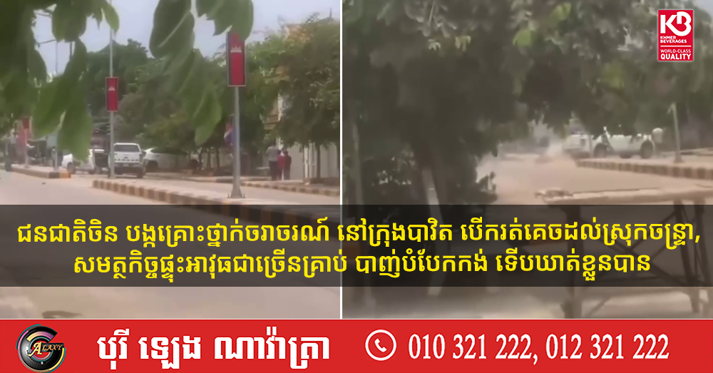 ជនជាតិចិន បង្កគ្រោះថ្នាក់ចរាចរណ៍ នៅក្រុងបាវិត បើករត់គេចដល់ស្រុកចន្ទ្រា, សមត្ថកិច្ចផ្ទុះអាវុធជាច្រើនគ្រាប់ បាញ់បំបែកកង់ ទើបឃាត់ខ្លួនបាន