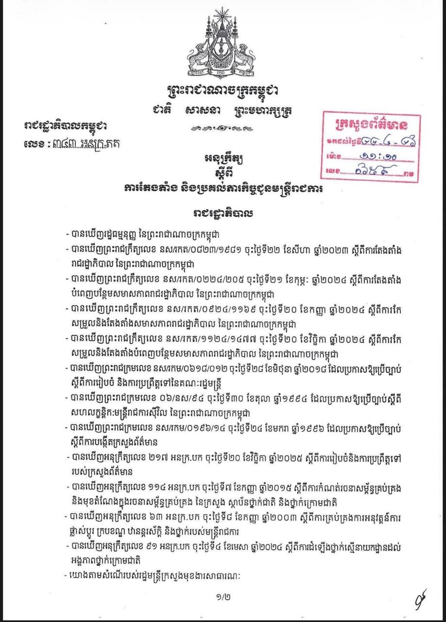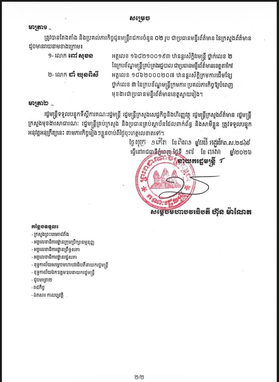 សម្តេចធិបតី ហ៊ុន ម៉ាណែត ចេញអនុក្រឹត្យតែងតាំងប្រធានមន្ទីរព័ត៌មានថ្មី ខេត្តស្វាយរៀង និងខេត្តតាកែវ