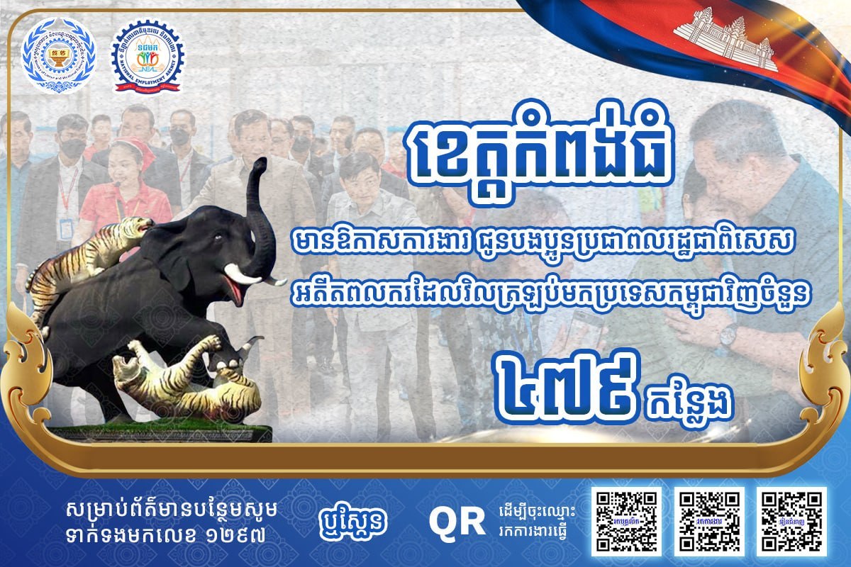 តាមរយៈការផ្សព្វផ្សាយរបស់ក្រសួងការងារបានឱ្យដឹងថា គិតត្រឹមថ្ងៃទី២៤ ខែមេសានេះ ខេត្តកំពង់ស្ពឺមានឱកាសការងារចំនួន ២៣,៧០៣កន្លែង កំពុងរង់ចាំបងប្អូនអតីតពលករត្រឡប់មកពីប្រទេសថៃ និងអ្នកកំពុងស្វែងរកការងារធ្វើទាក់ទងវិស័យឧស្សាហកម្ម។