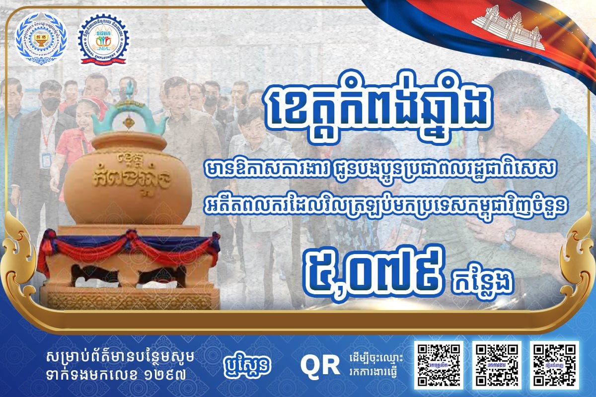 (កំពង់ស្ពឺ)៖ ក្រសួងការងារ និងបណ្ដុះបណ្ដាលវិជ្ជាជីវៈ បានឱ្យដឹងថា ខេត្តកំពង់ស្ពឺ មានឱកាសការងារប្រមាណជាង ២ម៉ឺនកន្លែង សម្រាប់ផ្ដល់ជូនអតីតពលករត្រឡប់មកពីប្រទេសថៃ និងអ្នកកំពុងស្វែងរកការងារធ្វើ។