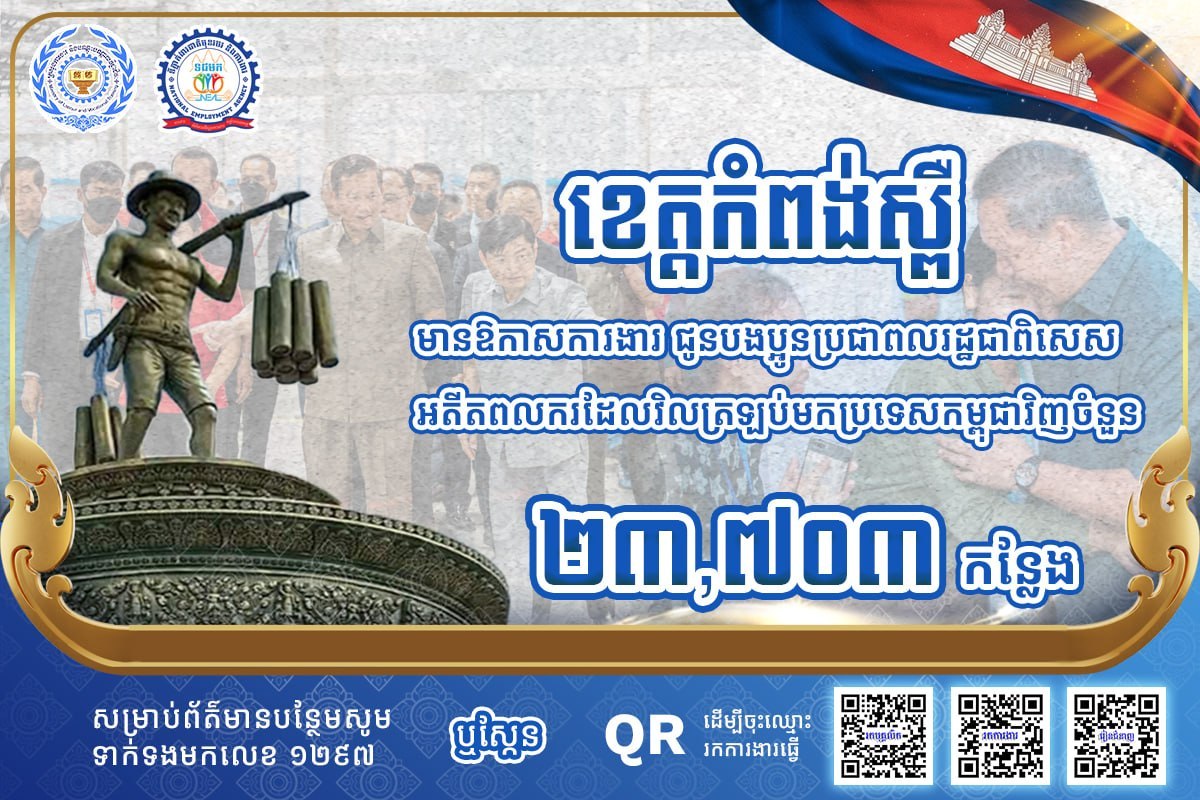 តាមរយៈការផ្សព្វផ្សាយរបស់ក្រសួងការងារបានឱ្យដឹងថា គិតត្រឹមថ្ងៃទី២៤ ខែមេសានេះ ខេត្តកំពង់ស្ពឺមានឱកាសការងារចំនួន ២៣,៧០៣កន្លែង កំពុងរង់ចាំបងប្អូនអតីតពលករត្រឡប់មកពីប្រទេសថៃ និងអ្នកកំពុងស្វែងរកការងារធ្វើទាក់ទងវិស័យឧស្សាហកម្ម។