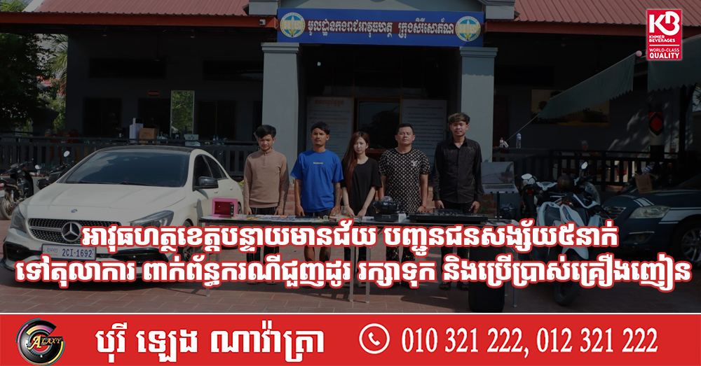 (បន្ទាយមានជ័យ)៖ កម្លាំងនគរបាលប្រឆាំងបទល្មើសសេដ្ឋកិច្ច កម្លាំងការិយាល័យផលិតកម្ម បសុព្យាបាល ខេត្តបន្ទាយមានជ័យ និងកម្លាំងអធិការដ្ឋាននគរបាលស្រុកម៉ាឡៃ ដឹកនាំដោយលោកវរសេនីយ៍ឯក រស់ អៀម នាយការិយាល័យ បានចុះធ្វើការស្រាវជ្រាវ ឈានទៅដល់ឃាត់បានរថយន្ត១គ្រឿងម៉ាក Toyota Camry លួចដឹកស្លាបមាន់បង្កកចំនួន៥២៨គីឡូក្រាម ចេញពីប្រទេសថៃ ចូលមកខេត្តបន្ទាយមានជ័យ តាមច្រករបៀងត្រង់ចំណុចលើផ្លូវជាតិលេខ៥៩ ស្ថិតក្នុងភូមិថ្មី ឃុំអូរស្រឡៅ ស្រុកម៉ាឡៃ ខេត្តបន្ទាយមានជ័យ នៅយប់ថ្ងៃទី២៤ ខែមេសា ឆ្នាំ២០២៦។