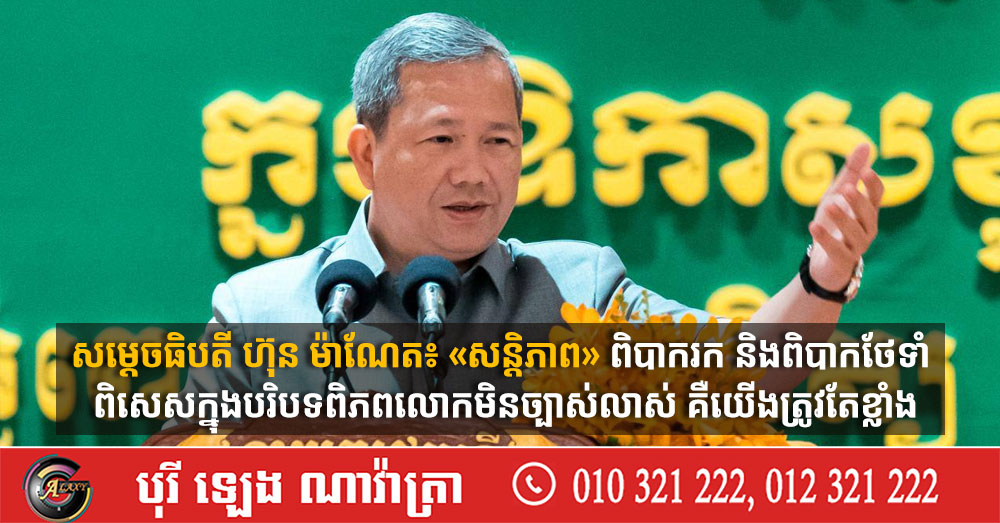 (ភ្នំពេញ)៖ សម្ដេចមហាបវរធិបតី ហ៊ុន ម៉ាណែត នាយករដ្ឋមន្ត្រីកម្ពុជា បានថ្លែងថា «សន្ដិភាព» ពិបាករក និងពិបាកថែទាំ ពិសេសក្នុងបរិបទពិភពលោកមិនច្បាស់លាស់ គឺយើងត្រូវតែខ្លាំង។