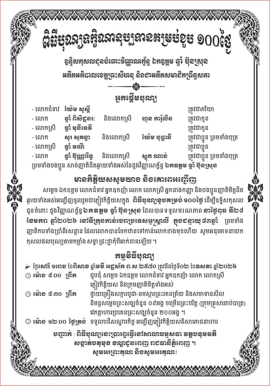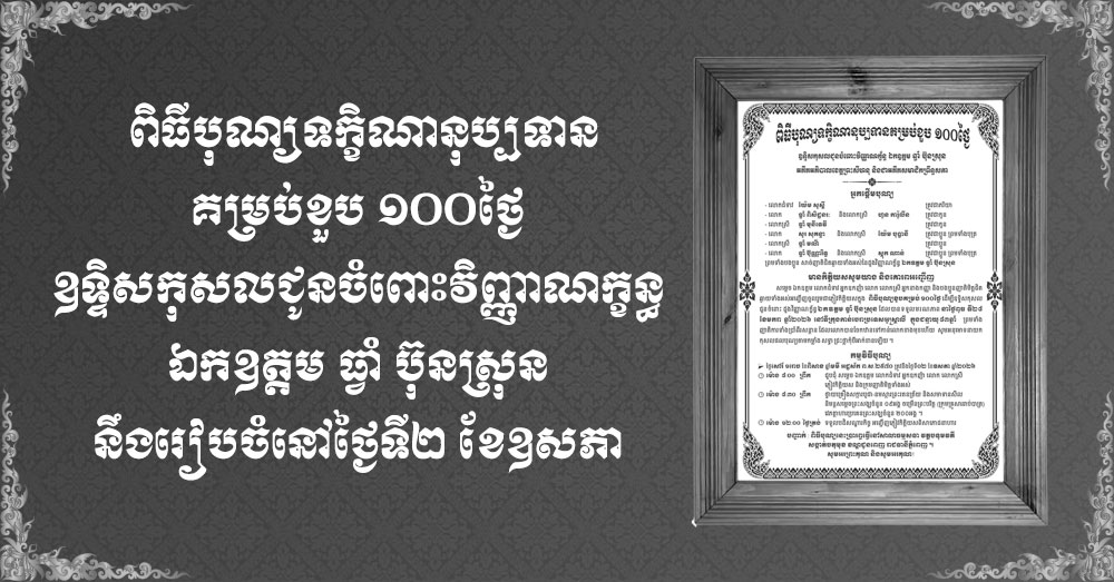 ពិធីបុណ្យទក្ខិណានុប្បទានគម្រប់ខួប ១០០ថ្ងៃ ឧទ្ទិសកុសលជូនចំពោះវិញ្ញាណក្ខន្ធ ឯកឧត្តម ធ្វាំ ប៊ុនស្រុន នឹងរៀបចំនៅថ្ងៃទី២ ខែឧសភា