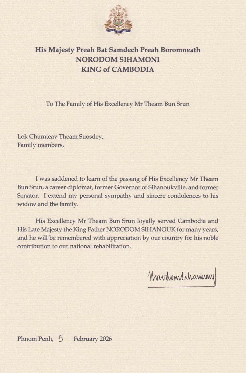 សូមជម្រាបថា ព្រះករុណា ព្រះសម្តេច ព្រះបរមនាថ នរោត្តម សីហមុនី បាទប្រទានព្រះរាជសាររំលែកទុក្ខ ដល់លោកជំទាវ យ៉ែម សួស្តី ភរិយា ឯកឧត្តម ធ្វាំ ប៊ុនស្រុន ចំពោះមរណភាពឯកឧត្តម ផងដែរ៕
