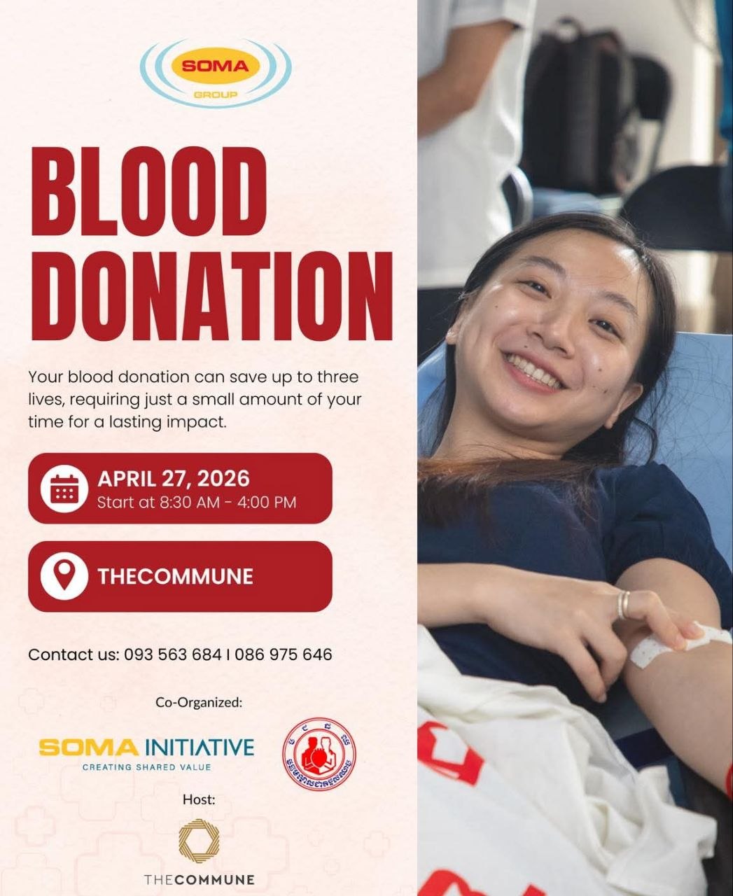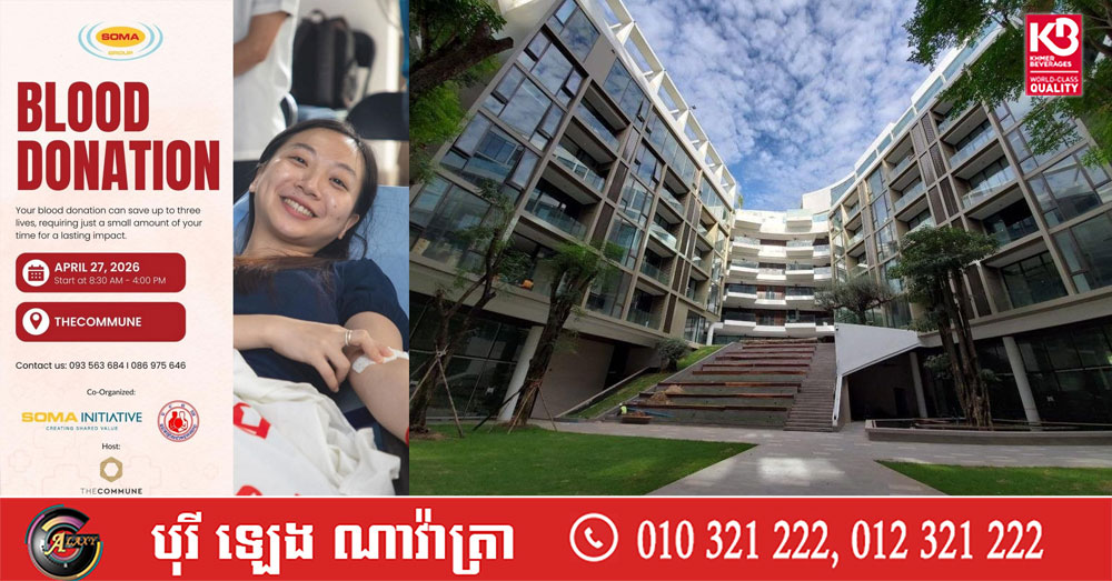 (ភ្នំពេញ)៖ ក្រុមហ៊ុន សោម៉ា សហការជាមួយមជ្ឈមណ្ឌលជាតិផ្ដល់ឈាម ដោយគ្រោងនឹងធ្វើឡើងពេញមួយថ្ងៃចាប់ពីម៉ោង៨ព្រឹក ដល់ម៉ោង៤រសៀល នាថ្ងៃទី២៧ ខែមេសា ឆ្នាំ២០២៦ នៅបរិវេណអគារ TheCommune ស្ថិតក្នុងសង្កាត់បឹងកក់១ ខណ្ឌទួលគោក រាជធានីភ្នំពេញ។