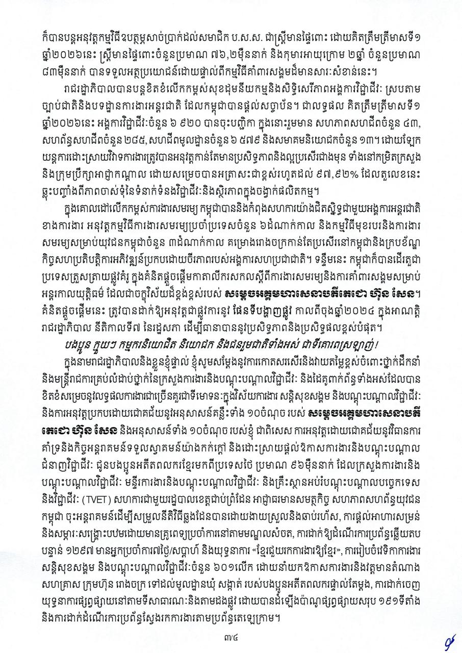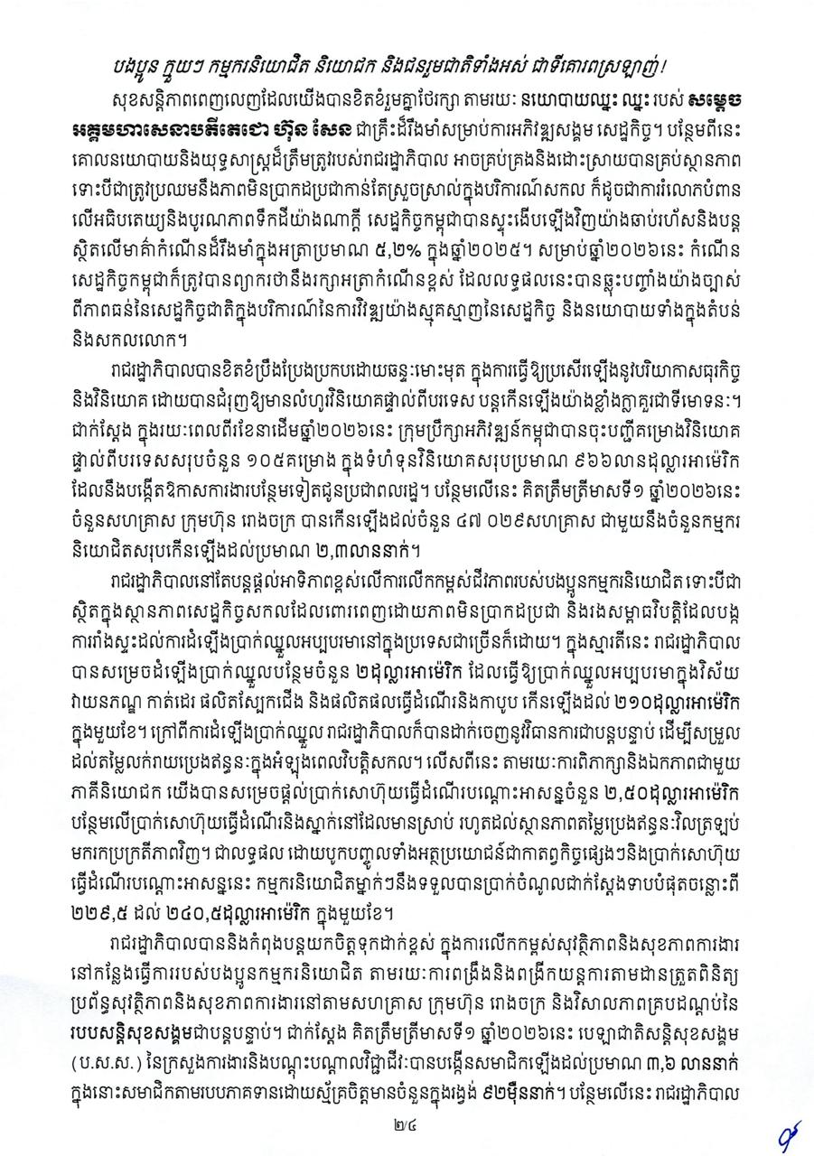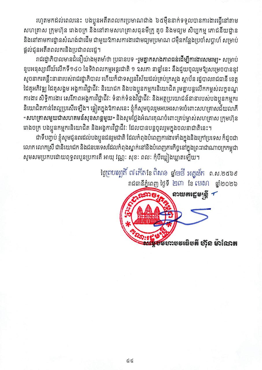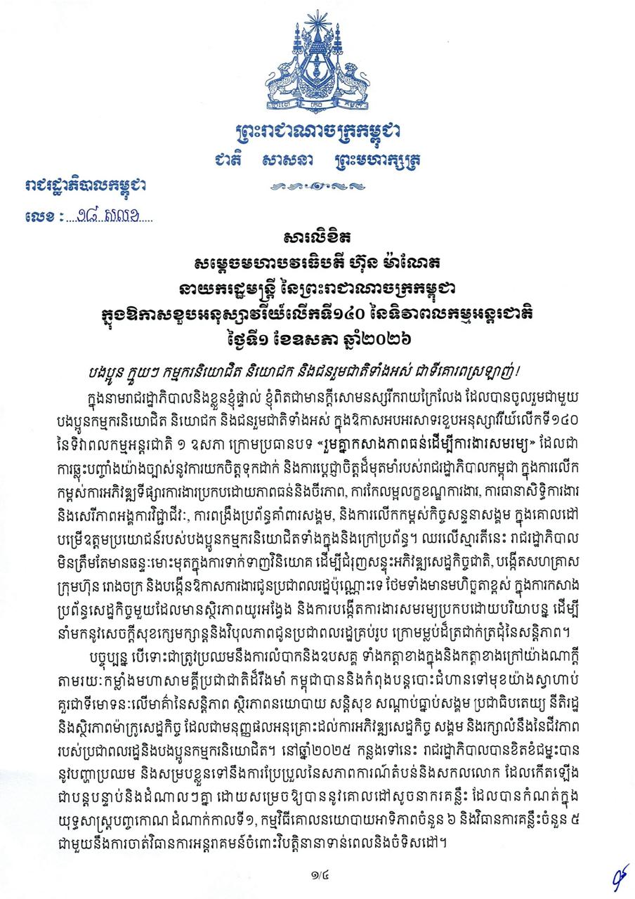 សម្តេចមហាបវរធិបតី ហ៊ុន ម៉ាណែត ចេញសារលិខិតក្នុងឱកាសខួបអនុស្សាវរីយ៍លើកទី១៤០ នៃទិវាពលកម្មអន្តរជាតិ ថ្ងៃទី១ ខែឧសភា ឆ្នាំ២០២៦