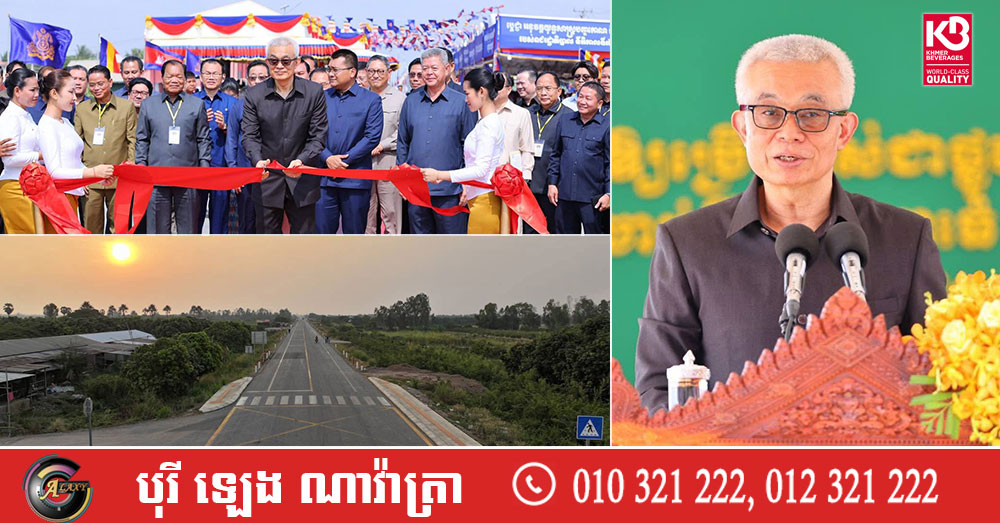 (កណ្តាល)៖ លោកអគ្គបណ្ឌិតសភាចារ្យ អូន ព័ន្ធមុនីរ័ត្ន ឧបនាយករដ្ឋមន្រ្តី រដ្ឋមន្រ្តីក្រសួងសេដ្ឋកិច្ច និងហិរញ្ញវត្ថុ តំណាងដ៏ខ្ពង់ខ្ពស់សម្តេចមហាបវរធិបតី ហ៊ុន ម៉ាណែត នាយករដ្ឋមន្រ្តីកម្ពុជា នាព្រឹកថ្ងៃទី២៧ ខែមេសា ឆ្នាំ២០២៦ នេះ បានអញ្ជើញជាអធិបតីសម្ពោធដាក់ឱ្យប្រើប្រាស់ជាផ្លូវការកំណាត់ផ្លូវជាតិលេខ២៣ មានប្រវែង ១៩,៨៣គីឡូម៉ែត្រ (ពីគល់ស្ពានកោះធំ) ស្ថិតក្នុងឃុំជ្រោយតាកែវ ឆ្លងកាត់ឃុំលើកដែក ស្រុកកោះធំ រហូតដល់ឃុំពាមរាំង ស្រុកលើកដែក នៃភូមិសាស្រ្តខេត្តកណ្តាល។