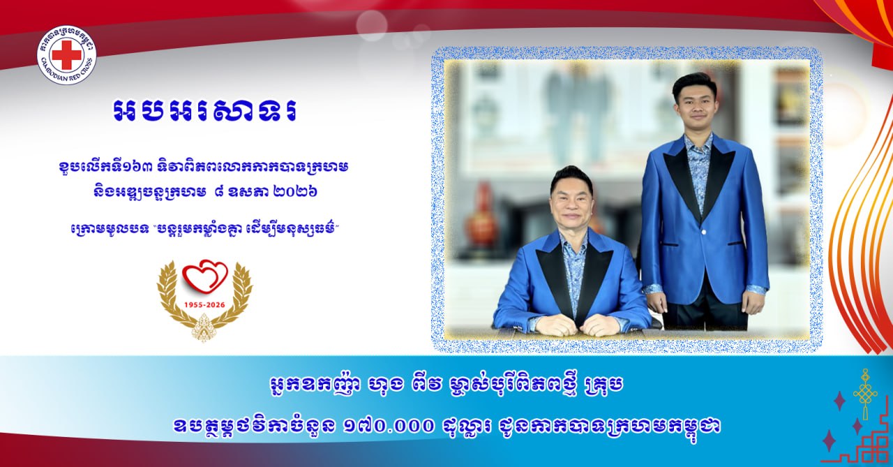 សម្តេចកិត្តិព្រឹទ្ធបណ្ឌិត ប៊ុន រ៉ានី ហ៊ុនសែន ប្រធានកាកបាទ ក្រហមកម្ពុជា សូមថ្លែងអំណរគុណយ៉ាងជ្រាលជ្រៅបំផុតចំពោះ អ្នកឧកញ៉ា ហុង ពីវ ម្ចាស់បុរីពិភពថ្មី គ្រុប ដែលបានឧបត្ថម្ភថវិកា ១៧០,០០០ដុល្លារអាមេរិក ជូនកាកបាទក្រហមកម្ពុជា ក្នុងឱកាសខួបលើកទី១៦៣ ទិវាពិភពលោក កាកបាទក្រហម និងអឌ្ឍចន្ទក្រហម ៨ ឧសភា ឆ្នាំ២០២៦ ក្រោមមូលបទ «បន្តរួមកម្លាំងគ្នា ដើម្បីមនុស្សធម៌»។