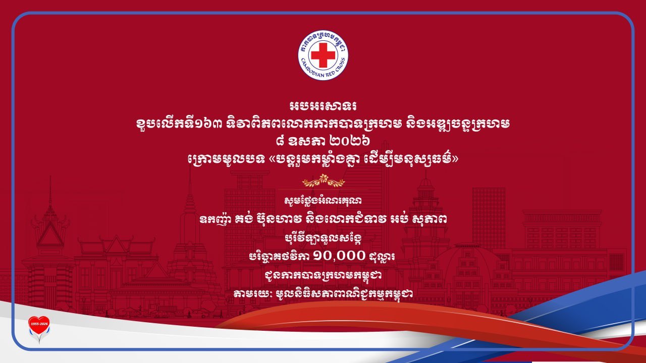 សម្តេចកិត្តិព្រឹទ្ធបណ្ឌិត ប៊ុន រ៉ានី ហ៊ុនសែន ប្រធានកាកបាទ ក្រហមកម្ពុជា សូមថ្លែងអំណរគុណយ៉ាងជ្រាលជ្រៅបំផុតចំពោះ ឧកញ៉ា គង់ ប៊ុនហាវ និងលោកជំទាវ អប់ សុភាព បុរីវីឡាទួលសង្កែ ដែលបានឧបត្ថម្ភថវិកា ១ម៉ឺនដុល្លារអាមេរិក ជូនកាកបាទក្រហមកម្ពុជា ក្នុងឱកាសខួបលើកទី១៦៣ ទិវាពិភពលោក កាកបាទក្រហម និងអឌ្ឍចន្ទក្រហម ៨ ឧសភា ឆ្នាំ២០២៦ ក្រោមមូលបទ «បន្តរួមកម្លាំងគ្នា ដើម្បីមនុស្សធម៌»។