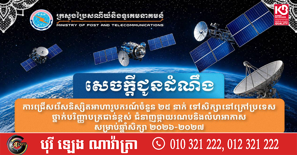 ក្រសួងប្រៃសណីយ៍ ជ្រើសរើសនិស្សិតអាហារូបករណ៍ ២៥នាក់ ទៅសិក្សានៅក្រៅប្រទេសថ្នាក់បរិញ្ញាបត្រជាន់ខ្ពស់ ជំនាញផ្កាយរណប និងលំហអាកាស សម្រាប់ឆ្នាំសិក្សា២០២៦-២០២៧