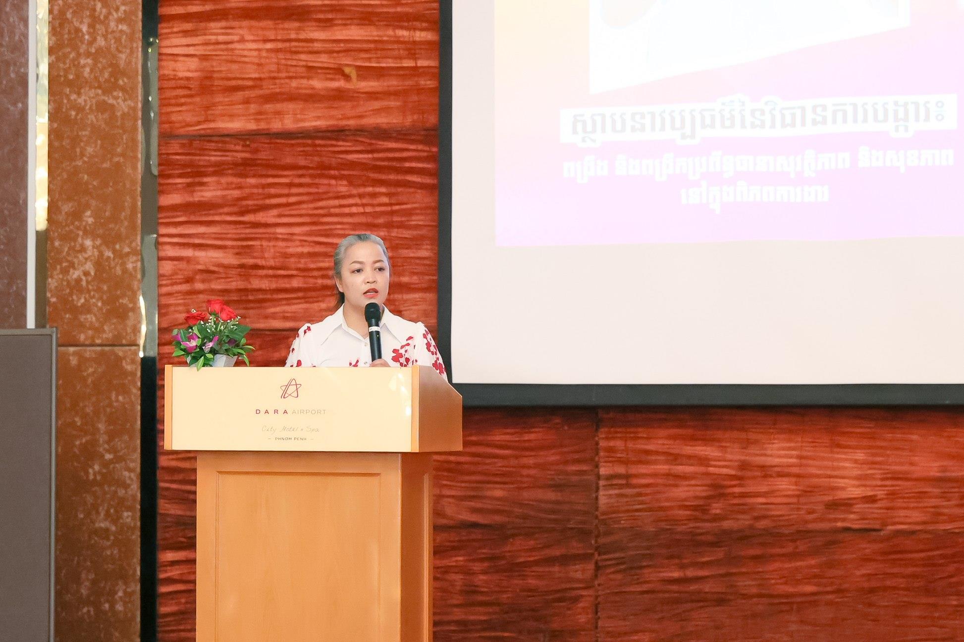 ថ្លែងក្នុងឱកាសនោះ លោកស្រី រដ្ឋលេខាធិការប្រចាំការ បានបញ្ជាក់អំពីសារៈសំខាន់នៃការលើកកម្ពស់លក្ខខណ្ឌសុវត្ថិភាព និងសុខភាពការងារ ដើម្បីធានានូវការងារសមរម្យសម្រាប់ទាំងអស់គ្នា។ លោកជំទាវក៏បានបញ្ជាក់បន្ថែមផងដែរថា គ្រប់ភាគីពាក់ព័ន្ធ រួមមាន រាជរដ្ឋាភិបាល និយោជក និងកម្មករនិយោជិត ត្រូវតែសហការគ្នាអនុវត្តតាមតួនាទីក្នុងការជំរុញឲ្យមានវប្បធម៌សុវត្ថិភាព និងសុខភាពការងារ ដើម្បីលើកកម្ពស់សុខុមាលភាពរបស់កម្មករនិយោជិតនិងផលិតភាពការងារ។