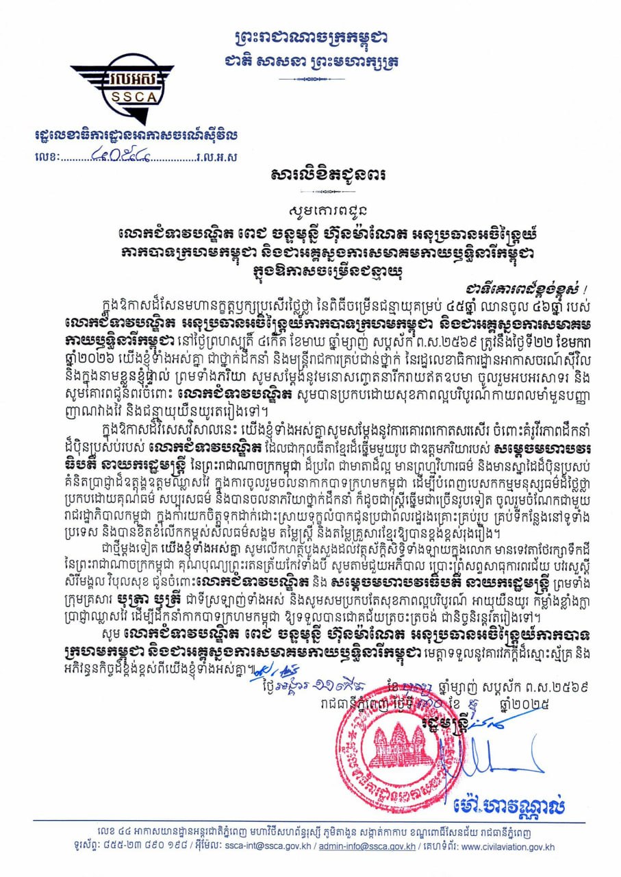 (ភ្នំពេញ)៖ ឯកឧត្ដមបណ្ឌិត ម៉ៅ ហាវណ្ណាល់ រដ្ឋមន្រ្តីទទួលបន្ទុករដ្ឋលេខាធិការដ្ឋានអាកាសចរណ៍ស៊ីវិល និងលោកជំទាវ ព្រមទាំងថ្នាក់ដឹកនាំ និងមន្ត្រីរាជការទាំងអស់ សូមគោរពជូននូវសព្ទសាធុការពរគ្រប់ប្រការជូនចំពោះ លោកជំទាវបណ្ឌិត ពេជ ចន្ទមុន្នី ហ៊ុន ម៉ាណែត ក្នុងឱកាសដ៏ឧត្តុង្គឧត្តមថ្លៃថ្លា នៃពិធីចម្រើនជន្មាយុ ដែលប្រព្រឹត្តទៅនៅថ្ងៃទី២២ ខែមករា ឆ្នាំ២០២៦នេះ។