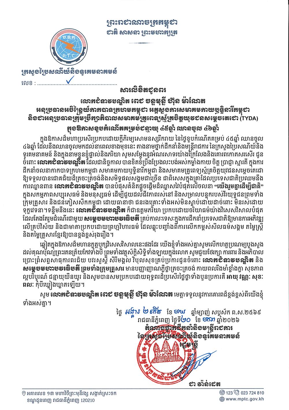 (ភ្នំពេញ)៖ ឯកឧត្តម ជា វ៉ាន់ដេត រដ្ឋមន្ត្រីក្រសួងប្រៃសណីយ៍ និងទូរគមនាគមន៍ ព្រមទាំងថ្នាក់ដឹកនាំ និងមន្ត្រីរាជការទាំងអស់ សូមគោរពជូននូវសព្ទសាធុការពរគ្រប់ប្រការជូនចំពោះ លោកជំទាវបណ្ឌិត ពេជ ចន្ទមុន្នី ហ៊ុន ម៉ាណែត ក្នុងឱកាសដ៏ឧត្តុង្គឧត្តមថ្លៃថ្លា នៃពិធីចម្រើនជន្មាយុ ដែលប្រព្រឹត្តទៅនៅថ្ងៃទី២២ ខែមករា ឆ្នាំ២០២៦នេះ។