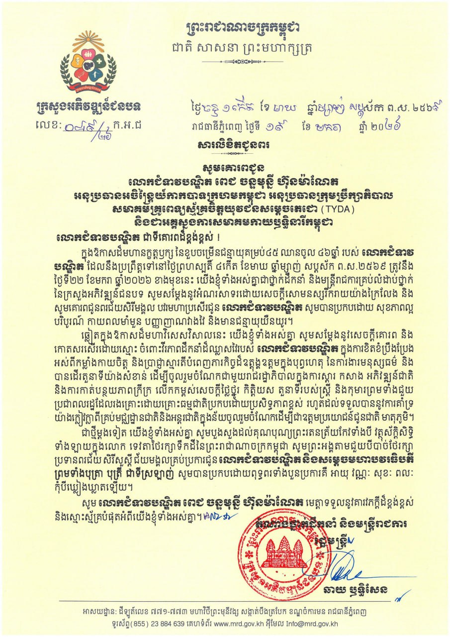 (ភ្នំពេញ)៖ ឯកឧត្តម ឆាយ ឫទ្ធិសែន រដ្ឋមន្រ្តីក្រសួងអភិវឌ្ឍន៍ជនបទ ព្រមទាំងថ្នាក់ដឹកនាំ មន្ត្រីរាជការគ្រប់លំដាប់ថ្នាក់ សូមគោរពជូននូវសព្ទសាធុការពរគ្រប់ប្រការជូនចំពោះ លោកជំទាវបណ្ឌិត ពេជ ចន្ទមុន្នី ហ៊ុន ម៉ាណែត ក្នុងឱកាសដ៏ឧត្តុង្គឧត្តមថ្លៃថ្លា នៃពិធីចម្រើនជន្មាយុ ដែលប្រព្រឹត្តទៅនៅថ្ងៃទី២២ ខែមករា ឆ្នាំ២០២៦នេះ។