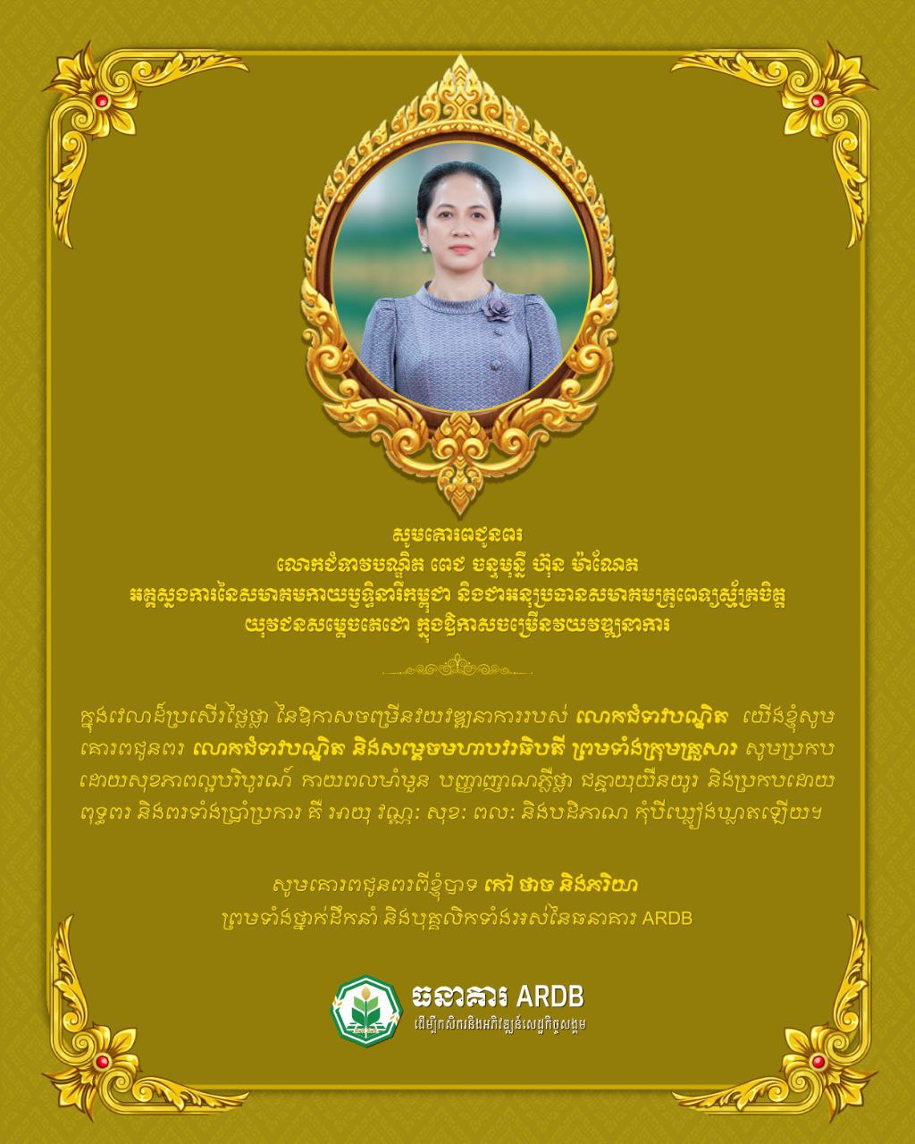 (ភ្នំពេញ)៖ ឯកឧត្តមបណ្ឌិត កៅ ថាច ប្រតិភូរាជរដ្ឋាភិបាលទទួលបន្ទុក ជាអគ្គនាយកធនាគារអភិវឌ្ឍន៍ជនបទ និងកសិកម្ម (ARDB) ព្រមទាំងថ្នាក់ដឹកនាំ និងបុគ្គលិកទាំងអស់ សូមគោរពជូននូវសព្ទសាធុការពរគ្រប់ប្រការជូនចំពោះ លោកជំទាវបណ្ឌិត ពេជ ចន្ទមុន្នី ហ៊ុន ម៉ាណែត ក្នុងឱកាសដ៏ឧត្តុង្គឧត្តមថ្លៃថ្លា នៃពិធីចម្រើនជន្មាយុ ដែលប្រព្រឹត្តទៅនៅថ្ងៃទី២២ ខែមករា ឆ្នាំ២០២៦នេះ។