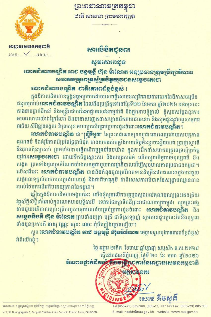 (ភ្នំពេញ)៖ លោកជំទាវ សោម គីមសួគ៌ អគ្គសវនករនៃអាជ្ញាធរសវនកម្មជាតិ សូមគោរពជូននូវសព្ទសាធុការពរគ្រប់ប្រការជូនចំពោះ លោកជំទាវបណ្ឌិត ពេជ ចន្ទមុន្នី ហ៊ុន ម៉ាណែត ក្នុងឱកាសដ៏ឧត្តុង្គឧត្តមថ្លៃថ្លា នៃពិធីចម្រើនជន្មាយុ ដែលប្រព្រឹត្តទៅនៅថ្ងៃទី២២ ខែមករា ឆ្នាំ២០២៦នេះ។