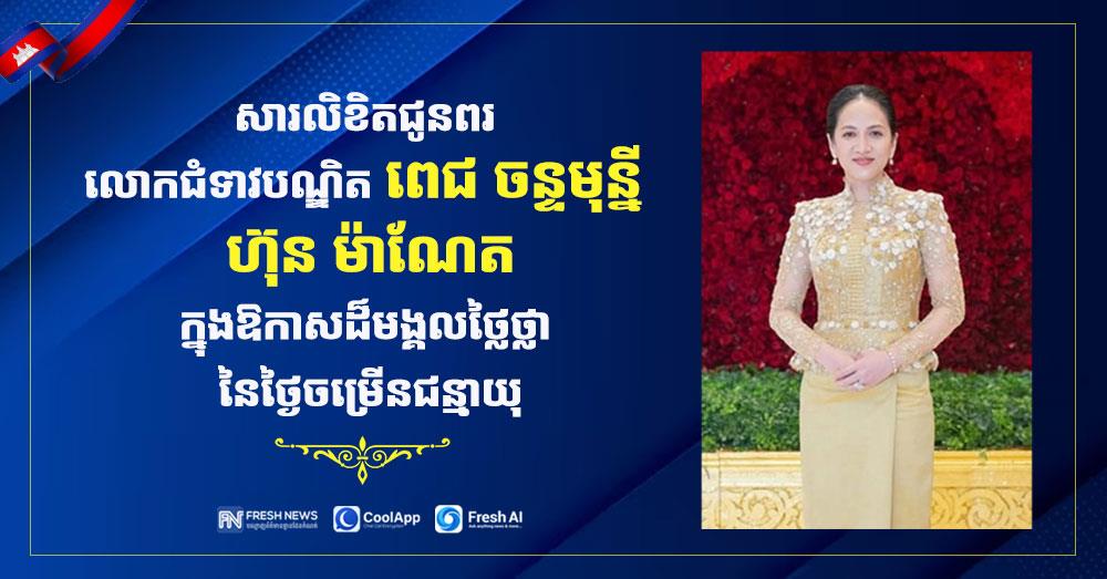 លោកជំទាវបណ្ឌិតឧកញ៉ា ឡេង បញ្ចពណ៌ ផ្ញើសារលិខិតជូនពរ ជូនចំពោះលោកជំទាវបណ្ឌិត ពេជ ចន្ទមុន្នី ហ៊ុន ម៉ាណែត ក្នុងឱកាសពិធីចម្រើនជន្មាយុ