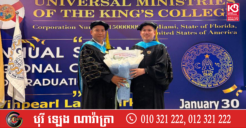 (ភ្នំពេញ)៖ ឯកឧត្តមបណ្ឌិត ប៊ុន ចាន់ដារ៉ា អគ្គនាយក និងបុគ្គលិកក្រោមឱវាទនៃក្រុមហ៊ុន GLOPACO សូមផ្ញើសារលិខិតជូនពរ និងអបអរសាទរជូនចំពោះ អ្នកឧកញ៉ាបណ្ឌិត សួរ វីរៈ អគ្គនាយកក្រុមហ៊ុន វិរៈ ប៊ុនថាំ អេចប្រេស ក្នុងឱកាសដែលអ្នកឧកញ៉ាបណ្ឌិត ទទួលបានសញ្ញាបត្រ «បណ្ឌិតទស្សនវិជ្ជា ផ្នែកគ្រប់គ្រងទូទៅ - Doctor of Philosophy In General Management» ពីសាកលវិទ្យាល័យ Universal ministries of the king's college ថ្ងៃទី៣០ ខែមករា ឆ្នាំ២០២៦។