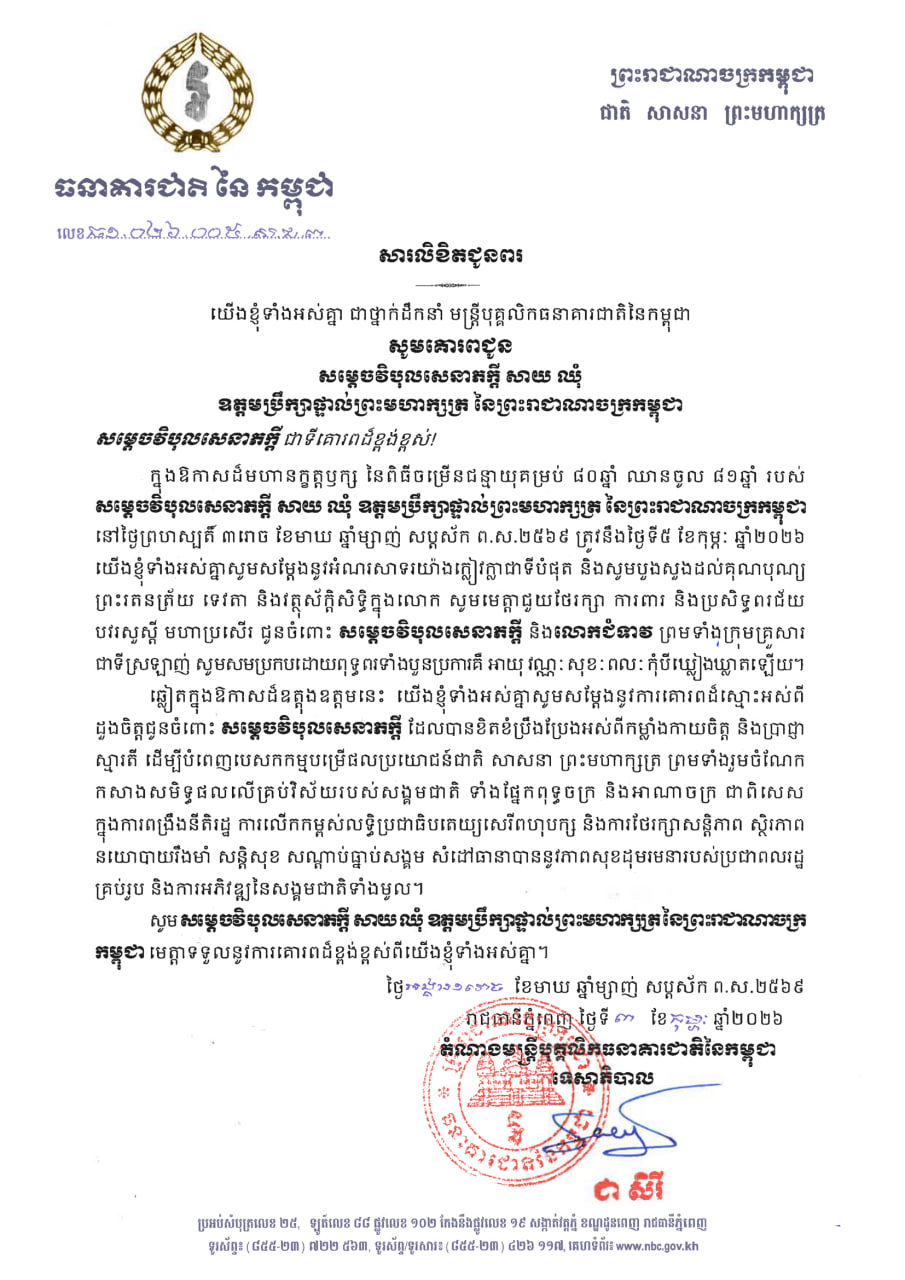 (ភ្នំពេញ)៖ លោកជំទាវបណ្ឌិត ជា សិរី អគ្គទេសាភិបាល ព្រមទាំងថ្នាក់ដឹកនាំ មន្ត្រីបុគ្គលិក ធនាគារជាតិនៃកម្ពុជាទាំងអស់ សម្តេចវិបុលសេនាភក្តី សាយ ឈុំ ឧត្តមប្រឹក្សាផ្ទាល់ព្រះមហាក្សត្រ ក្នុងឱកាសចម្រើនជន្មាយុ ដែលប្រព្រឹត្តទៅនៅថ្ងៃព្រហស្បតិ៍ ៣រោច ខែមាឃ ឆ្នាំម្សាញ់ សប្តស័ក ពុទ្ធសករាជ ២៥៦៩ ត្រូវនឹងថ្ងៃទី៥ ខែកុម្ភៈ ឆ្នាំ២០២៦។
