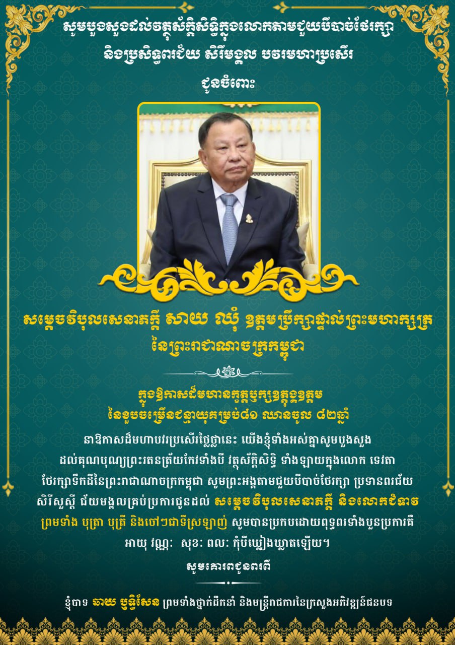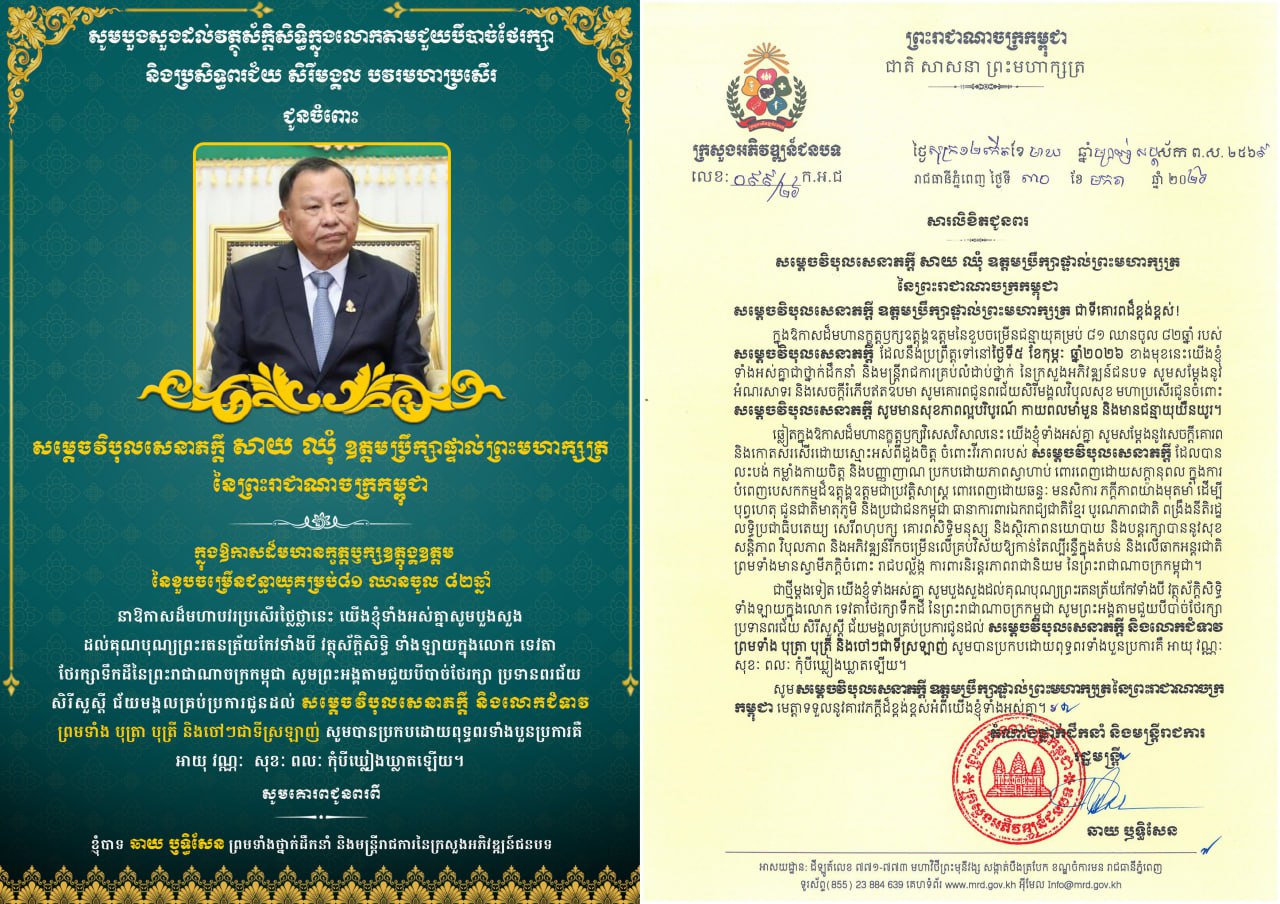 (ភ្នំពេញ)៖ ឯកឧត្តម ឆាយ ឫទ្ធិសែន រដ្ឋមន្រ្តីក្រសួងអភិវឌ្ឍន៍ជនបទ ព្រមទាំងថ្នាក់ដឹកនាំ មន្ត្រីរាជការគ្រប់លំដាប់ថ្នាក់ សូមគោរពជូនពរ សម្តេចវិបុលសេនាភក្តី សាយ ឈុំ ឧត្តមប្រឹក្សាផ្ទាល់ព្រះមហាក្សត្រ ក្នុងឱកាសចម្រើនជន្មាយុ ដែលប្រព្រឹត្តទៅនៅថ្ងៃព្រហស្បតិ៍ ៣រោច ខែមាឃ ឆ្នាំម្សាញ់ សប្តស័ក ពុទ្ធសករាជ ២៥៦៩ ត្រូវនឹងថ្ងៃទី៥ ខែកុម្ភៈ ឆ្នាំ២០២៦។