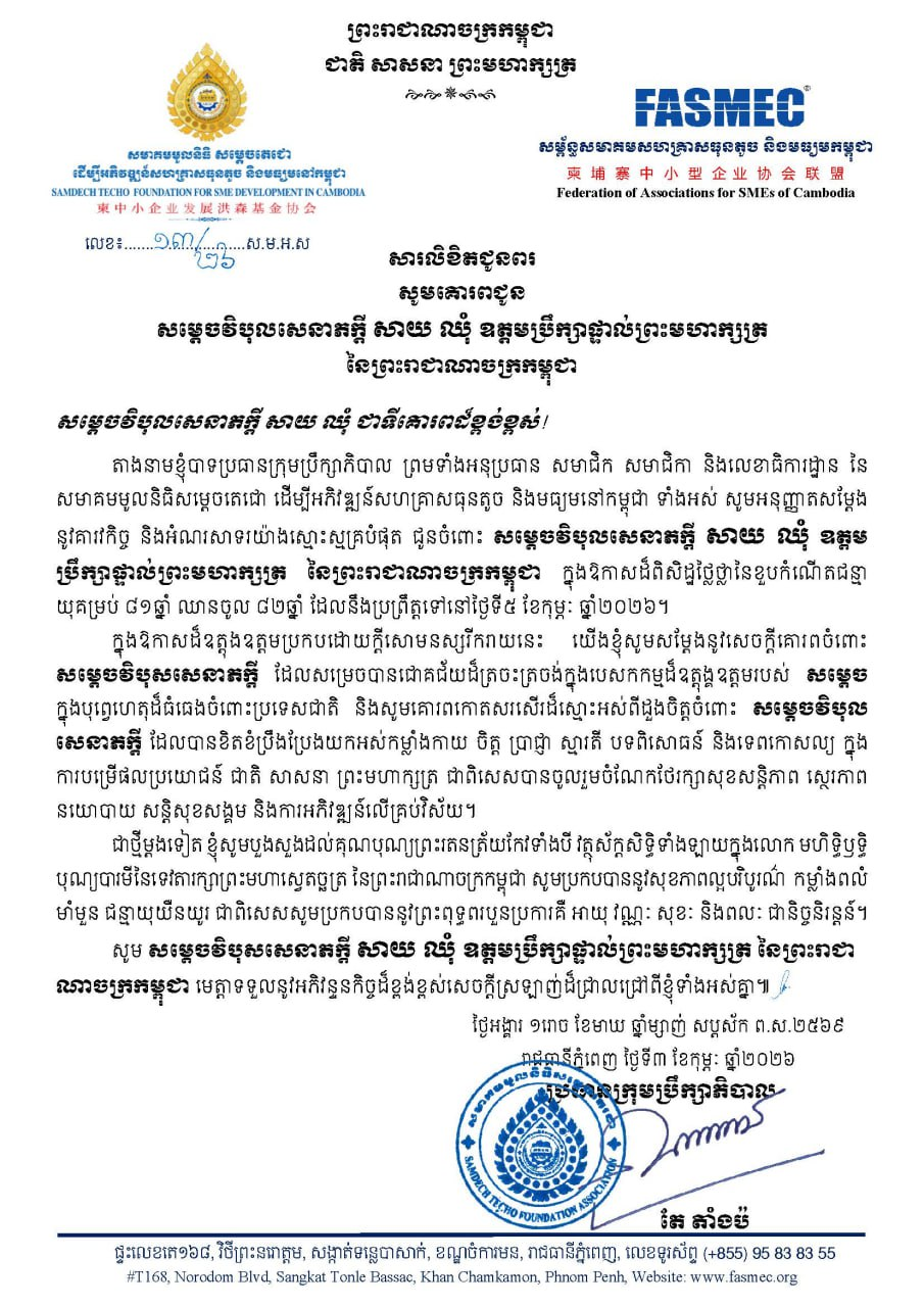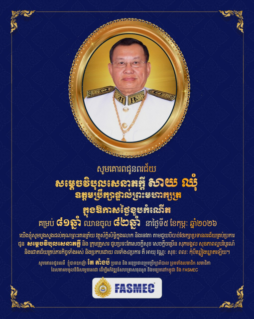 (ភ្នំពេញ)៖ ឧកញ៉ា តែ តាំងប៉ ប្រធានក្រុមប្រឹក្សាភិបាល ព្រមទាំងអនុប្រធាន សមាជិក-សមាជិកាទាំងអស់ នៃសមាគមមូលនិធិសម្ដេចតេជោ ដើម្បីអភិវឌ្ឍន៍សហគ្រាសធុនតូច និងមធ្យមនៅកម្ពុជា សូមគោរពជូនពរ សម្តេចវិបុលសេនាភក្តី សាយ ឈុំ ឧត្តមប្រឹក្សាផ្ទាល់ព្រះមហាក្សត្រ ក្នុងឱកាសចម្រើនជន្មាយុ ដែលប្រព្រឹត្តទៅនៅថ្ងៃព្រហស្បតិ៍ ៣រោច ខែមាឃ ឆ្នាំម្សាញ់ សប្តស័ក ពុទ្ធសករាជ ២៥៦៩ ត្រូវនឹងថ្ងៃទី៥ ខែកុម្ភៈ ឆ្នាំ២០២៦។