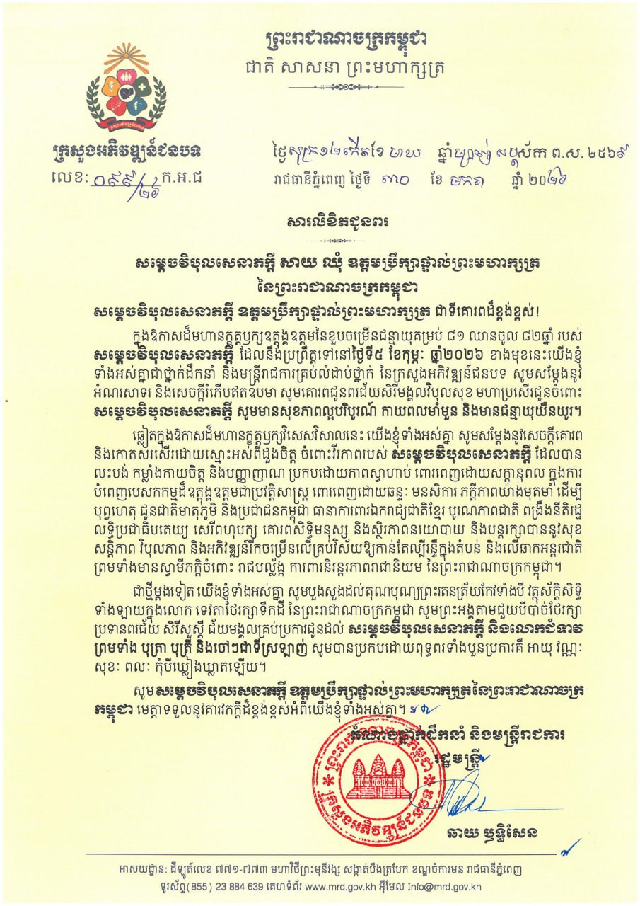 (ភ្នំពេញ)៖ ឯកឧត្តមសាស្ត្រាចារ្យ ឈាង រ៉ា រដ្ឋមន្ត្រីក្រសួងសុខាភិបាល សូមគោរពជូនពរ សម្តេចវិបុលសេនាភក្តី សាយ ឈុំ ឧត្តមប្រឹក្សាផ្ទាល់ព្រះមហាក្សត្រ ក្នុងឱកាសចម្រើនជន្មាយុ ដែលប្រព្រឹត្តទៅនៅថ្ងៃព្រហស្បតិ៍ ៣រោច ខែមាឃ ឆ្នាំម្សាញ់ សប្តស័ក ពុទ្ធសករាជ ២៥៦៩ ត្រូវនឹងថ្ងៃទី៥ ខែកុម្ភៈ ឆ្នាំ២០២៦។