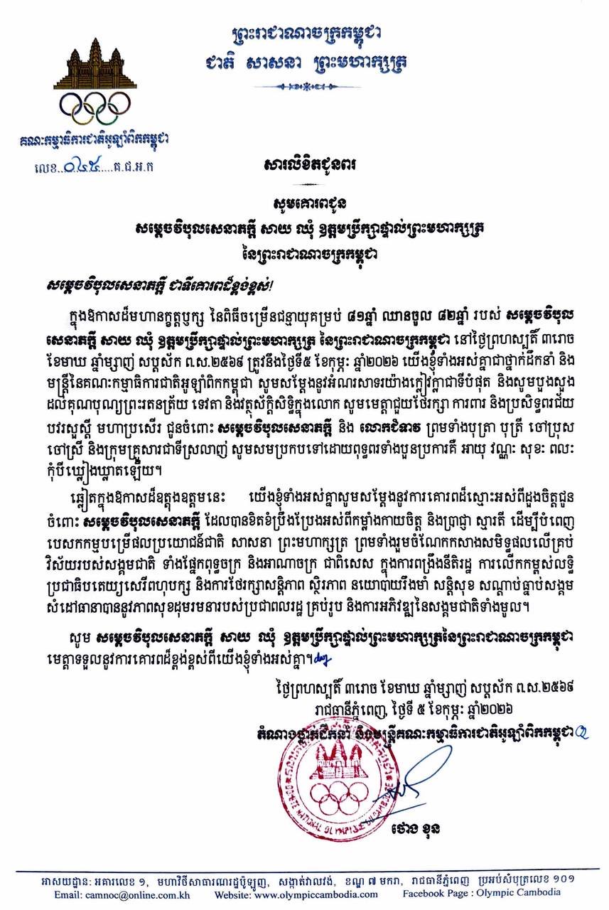 (ភ្នំពេញ)៖ ឯកឧត្តមបណ្ឌិត ថោង ខុន ទេសរដ្ឋមន្ត្រីទទួលបន្ទុកបេសកកម្មពិសេស និងជាប្រធានគណៈកម្មាធិការជាតិអូឡាំពិកកម្ពុជា និងមន្ត្រីរាជការនៃគណៈកម្មាធិការជាតិអូឡាំពិកកម្ពុជា សូមគោរពជូនពរ សម្តេចវិបុលសេនាភក្តី សាយ ឈុំ ឧត្តមប្រឹក្សាផ្ទាល់ព្រះមហាក្សត្រ ក្នុងឱកាសចម្រើនជន្មាយុ ដែលប្រព្រឹត្តទៅនៅថ្ងៃព្រហស្បតិ៍ ៣រោច ខែមាឃ ឆ្នាំម្សាញ់ សប្តស័ក ពុទ្ធសករាជ ២៥៦៩ ត្រូវនឹងថ្ងៃទី៥ ខែកុម្ភៈ ឆ្នាំ២០២៦។
