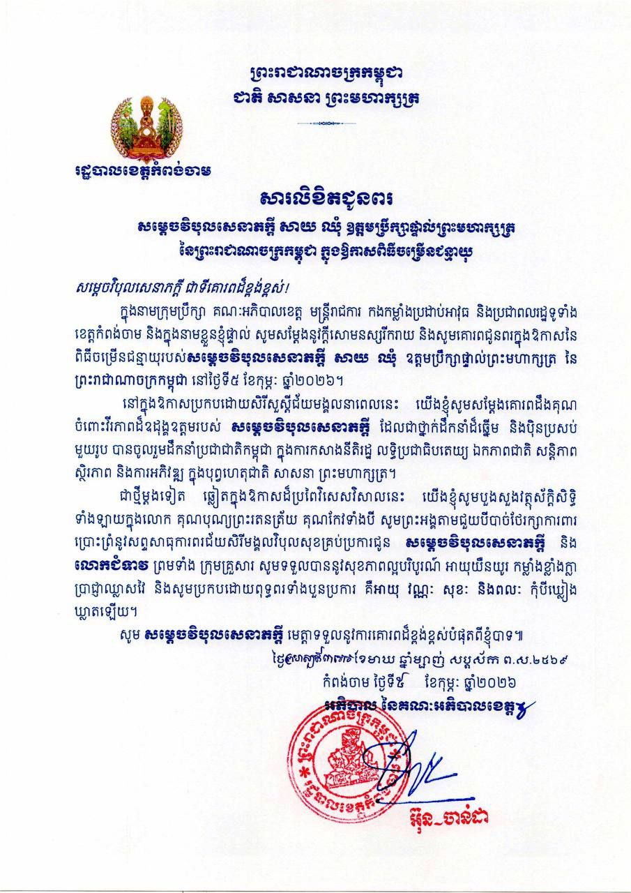 (ភ្នំពេញ)៖ ឯកឧត្តម អ៊ុន ចាន់ដា អភិបាលខេត្តកំពង់ចាម ព្រមទាំងថ្នាក់ដឹកនាំ មន្រ្តីរាជការ កងកម្លាំងប្រដាប់អាវុធ និងប្រជាពលរដ្ឋទូទាំងខេត្តកំពង់ចាម សូមគោរពជូនពរ សម្តេចវិបុលសេនាភក្តី សាយ ឈុំ ឧត្តមប្រឹក្សាផ្ទាល់ព្រះមហាក្សត្រ ក្នុងឱកាសចម្រើនជន្មាយុ ដែលប្រព្រឹត្តទៅនៅថ្ងៃព្រហស្បតិ៍ ៣រោច ខែមាឃ ឆ្នាំម្សាញ់ សប្តស័ក ពុទ្ធសករាជ ២៥៦៩ ត្រូវនឹងថ្ងៃទី៥ ខែកុម្ភៈ ឆ្នាំ២០២៦។