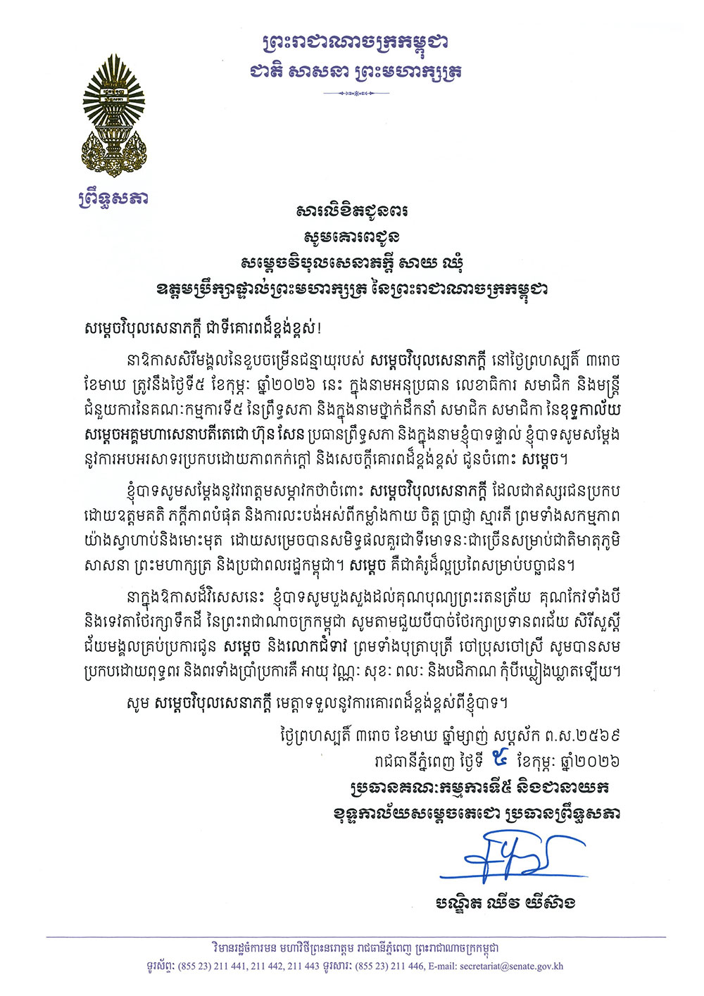 (ភ្នំពេញ)៖ ឯកឧត្តមបណ្ឌិត ឈីវ យីស៊ាង នាយកខុទ្ទកាល័យ សម្ដេចអគ្គមហាសេនាបតីតេជោ ហ៊ុន សែន ប្រធានព្រឹទ្ធសភា សូមគោរពជូនពរ សម្តេចវិបុលសេនាភក្តី សាយ ឈុំ ឧត្តមប្រឹក្សាផ្ទាល់ព្រះមហាក្សត្រ ក្នុងឱកាសចម្រើនជន្មាយុ ដែលប្រព្រឹត្តទៅនៅថ្ងៃព្រហស្បតិ៍ ៣រោច ខែមាឃ ឆ្នាំម្សាញ់ សប្តស័ក ពុទ្ធសករាជ ២៥៦៩ ត្រូវនឹងថ្ងៃទី៥ ខែកុម្ភៈ ឆ្នាំ២០២៦។
