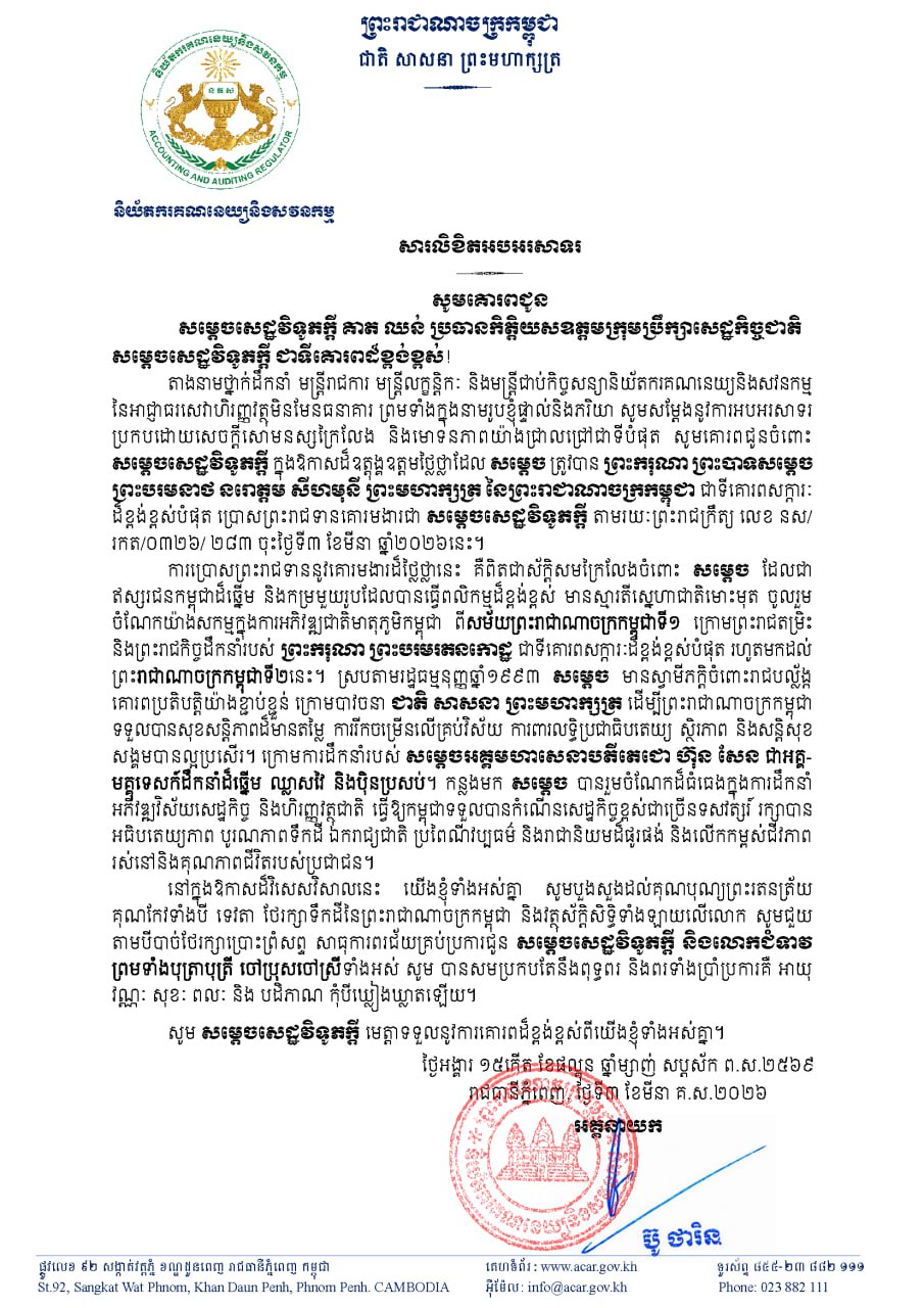 (ភ្នំពេញ)៖ ឯកឧត្តម ប៊ូ ថារិន អគ្គនាយក និយ័តករគណនេយ្យនិងសវនកម្ម បានផ្ញើសារអបអរសាទរជូនចំពោះឯកឧត្តមកិត្តិបរិរក្សបណ្ឌិត គាត ឈន់ ក្នុងឱកាសដែលឯកឧត្តមត្រូវបានព្រះករុណាព្រះបាទសម្តេចព្រះបរមនាថ នរោត្តម សីហមុនី ព្រះមហាក្សត្រនៃកម្ពុជា ចេញព្រះរាជក្រឹត្យត្រាស់បង្គាប់ផ្តល់គោរមងារដ៏ឧត្តុង្គឧត្តមខ្ពង់ខ្ពស់ជា «សម្តេចសេដ្ឋវិទូភក្តី គាត ឈន់»។