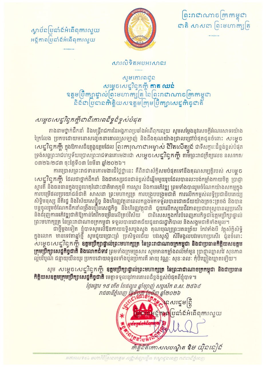 (ភ្នំពេញ)៖ ទេសរដ្ឋមន្ត្រី ឱម យ៉ិនទៀង ប្រធានអង្គភាពប្រឆាំងអំពើពុករលួយ ថ្នាក់ដឹកនាំ និងមន្ត្រីរាជការនៃអង្គភាពទាំងអស់ បានផ្ញើសារលិខិតសូមចូលរួមអបអរសាទរ និងគោរពជូនពរ ឯកឧត្តមកិត្តិបរិរក្សបណ្ឌិត គាត ឈន់ ប្រធានកិត្តិយសឧត្តមក្រុមប្រឹក្សាសេដ្ឋកិច្ច ក្នុងឱកាសត្រូវបាន ព្រះករុណាជាអម្ចាស់ជីវិតលើត្បូង ជាទីគោរពសក្ការៈដ៏ខ្ពង់ខ្ពស់បំផុត ព្រះអង្គសព្វព្រះរាជហឫទ័យ ប្រោសព្រះរាជទានគោរមងារជា «សម្តេចសេដ្ឋវិទូភក្តី គាត ឈន់»តាមរយៈព្រះរាជក្រឹត្យ ចុះថ្ងៃទី០៣ ខែមីនា ឆ្នាំ២០២៦។