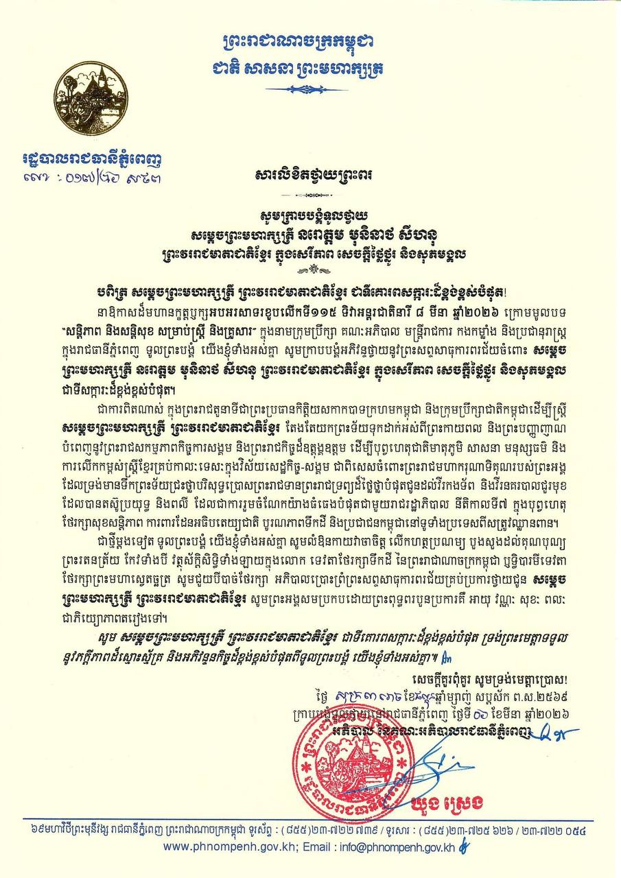 (ភ្នំពេញ)៖ ឯកឧត្តម ឃួង ស្រេង អភិបាលរាជធានីភ្នំពេញ ព្រមទាំងក្រុមប្រឹក្សា គណៈអភិបាល មន្រ្តីរាជការ និងកងកម្លាំងប្រដាប់អាវុធទាំងអស់ និងលោកជំទាវ សូមក្រាបបង្គំទូលថ្វាយសារលិខិតថ្វាយព្រះពរ សម្តេចព្រះមហាក្សត្រី នរោត្តម មុនិនាថ សីហនុ ព្រះវររាជមាតាជាតិខ្មែរ ក្នុងសេរីភាព សេចក្តីថ្លៃថ្នូរ និងសុភមង្គល នៅក្នុងឱកាសដ៏មហានក្ខត្តឫក្ស ប្រកបដោយសិរីសួស្តី បវរថ្លៃថ្លាមហាប្រសើរនៃការរំលឹកខួបលើកទី១១៥ នៃទិវានារីអន្តរជាតិ ៨មីនា ឆ្នាំ២០២៦។
