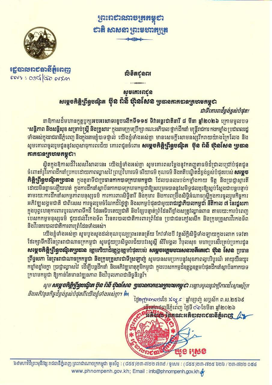 (ភ្នំពេញ)៖ ឯកឧត្តម ឃួង ស្រេង អភិបាលរាជធានីភ្នំពេញ ព្រមទាំងក្រុមប្រឹក្សា គណៈអភិបាល មន្រ្តីរាជការ និងកងកម្លាំងប្រដាប់អាវុធទាំងអស់ និងលោកជំទាវ បានផ្ញើសារលិខិតជូនពរគោរពជូនសម្តេចកិត្តិព្រឹទ្ធបណ្ឌិត ប៊ុន រ៉ានី ហ៊ុន សែន ប្រធានកាកបាទក្រហមកម្ពុជា នៅក្នុងឱកាសដ៏មហានក្ខត្តឫក្ស ប្រកបដោយសិរីសួស្តី បវរថ្លៃថ្លាមហាប្រសើរនៃការរំលឹកខួបលើកទី១១៥ នៃទិវានារីអន្តរជាតិ ៨មីនា ឆ្នាំ២០២៦។