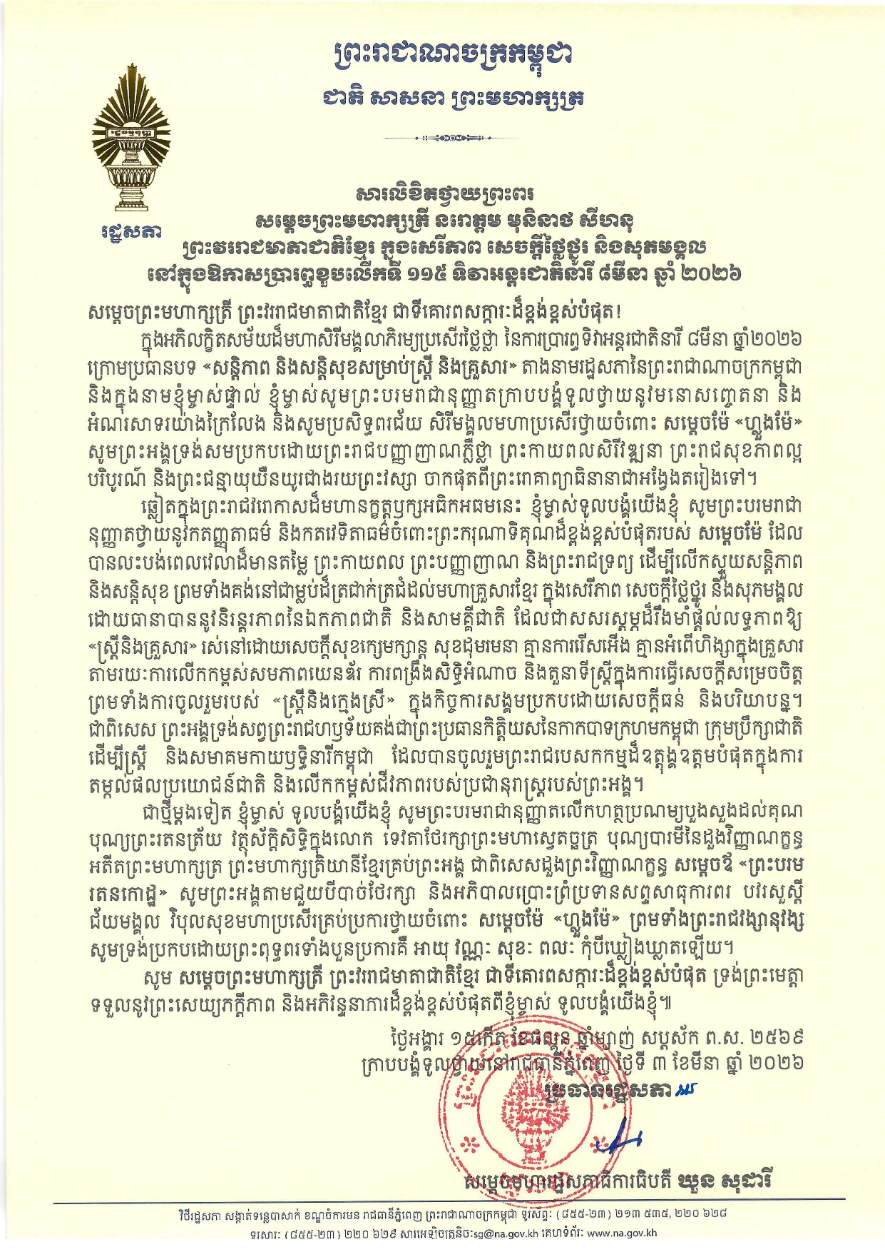 (ភ្នំពេញ)៖ សម្ដេចមហារដ្ឋសភាធិការធិបតី ឃួន សុដារី ប្រធានរដ្ឋសភា ព្រមទាំងថ្នាក់ដឹកនាំ និងមន្ត្រីរដ្ឋសភាទាំងអស់ សូមផ្ញើសារថ្វាយព្រះពរ សម្តេចព្រះមហាក្សត្រី នរោត្តម មុនិនាថ សីហនុ ព្រះវររាជមាតាជាតិខ្មែរ ក្នុងសេរីភាព សេចក្តីថ្លៃថ្នូរ និងសុភមង្គល នៅក្នុងឱកាសប្រារព្ធខួបលើកទី ១១៥ ទិវាអន្តរជាតិនារី ៨មីនា ឆ្នាំ២០២៦ ដែលធ្វើឡើងក្រោមប្រធានបទ «សន្តិភាព និងសន្តិសុខសម្រាប់ស្ត្រី និងគ្រួសារ»។