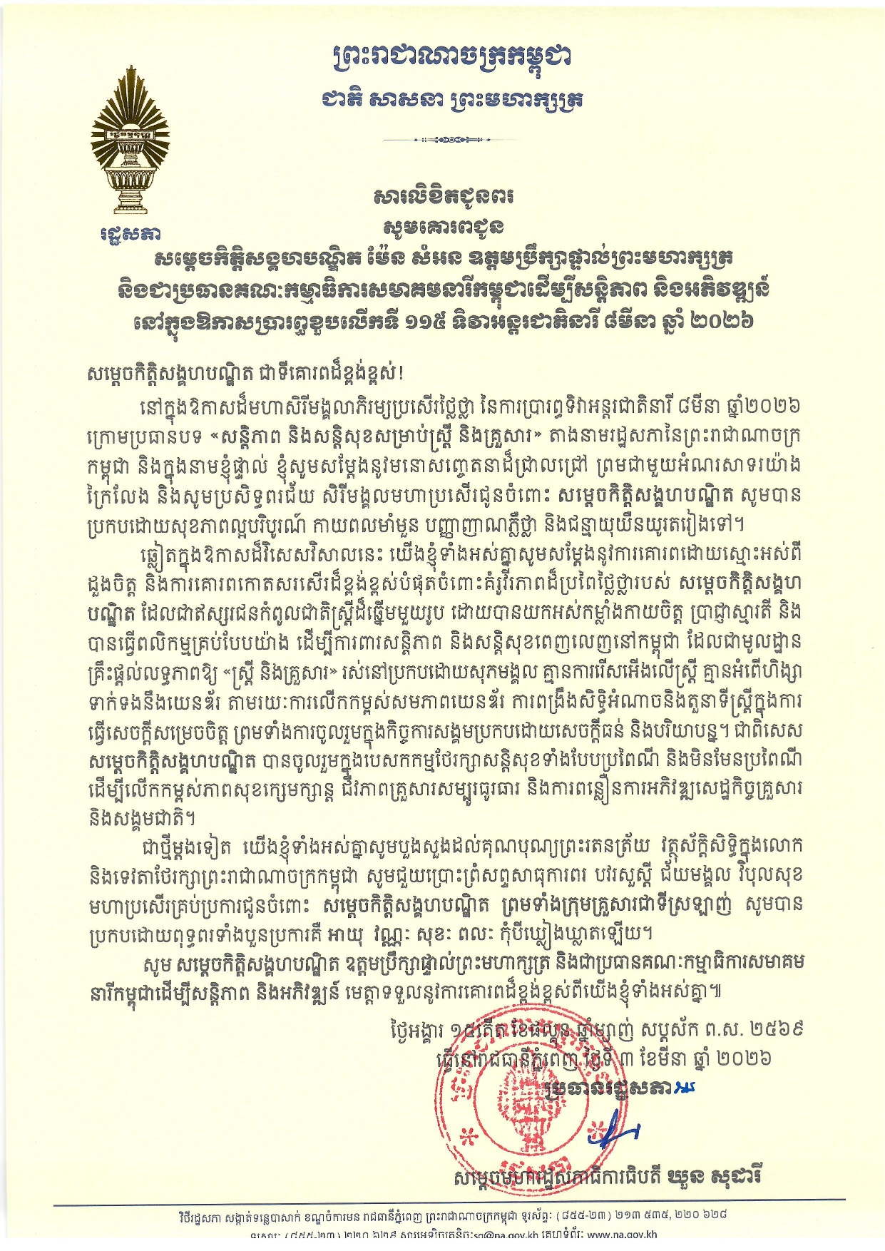 (ភ្នំពេញ)៖ សម្ដេចមហារដ្ឋសភាធិការធិបតី ឃួន សុដារី ប្រធានរដ្ឋសភា ព្រមទាំងថ្នាក់ដឹកនាំ និងមន្ត្រីរដ្ឋសភាទាំងអស់ សូមផ្ញើសារជូនពរ សម្ដេចកិត្តិសង្គហបណ្ឌិត ម៉ែន សំអន ឧត្តមប្រឹក្សាផ្ទាល់ព្រះមហាក្សត្រ នៅក្នុងឱកាសប្រារព្ធខួបលើកទី ១១៥ ទិវាអន្តរជាតិនារី ៨មីនា ឆ្នាំ២០២៦ ដែលធ្វើឡើងក្រោមប្រធានបទ «សន្តិភាព និងសន្តិសុខសម្រាប់ស្ត្រី និងគ្រួសារ»។