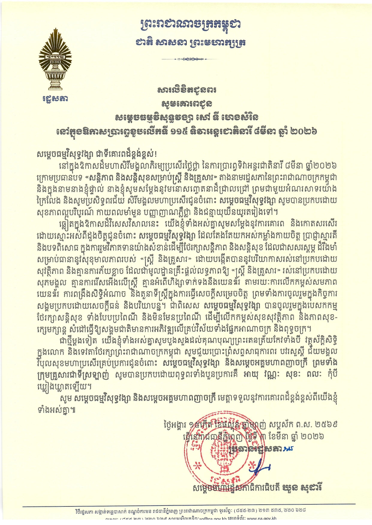 (ភ្នំពេញ)៖ សម្ដេចមហារដ្ឋសភាធិការធិបតី ឃួន សុដារី ប្រធានរដ្ឋសភា ព្រមទាំងថ្នាក់ដឹកនាំ និងមន្ត្រីរដ្ឋសភាទាំងអស់ សូមផ្ញើសារជូនពរ សម្តេចធម្មវិសុទ្ធវង្សា សៅ ទី ហេងសំរិន នៅក្នុងឱកាសប្រារព្ធខួបលើកទី ១១៥ ទិវាអន្តរជាតិនារី ៨មីនា ឆ្នាំ២០២៦ ដែលធ្វើឡើងក្រោមប្រធានបទ «សន្តិភាព និងសន្តិសុខសម្រាប់ស្ត្រី និងគ្រួសារ»។