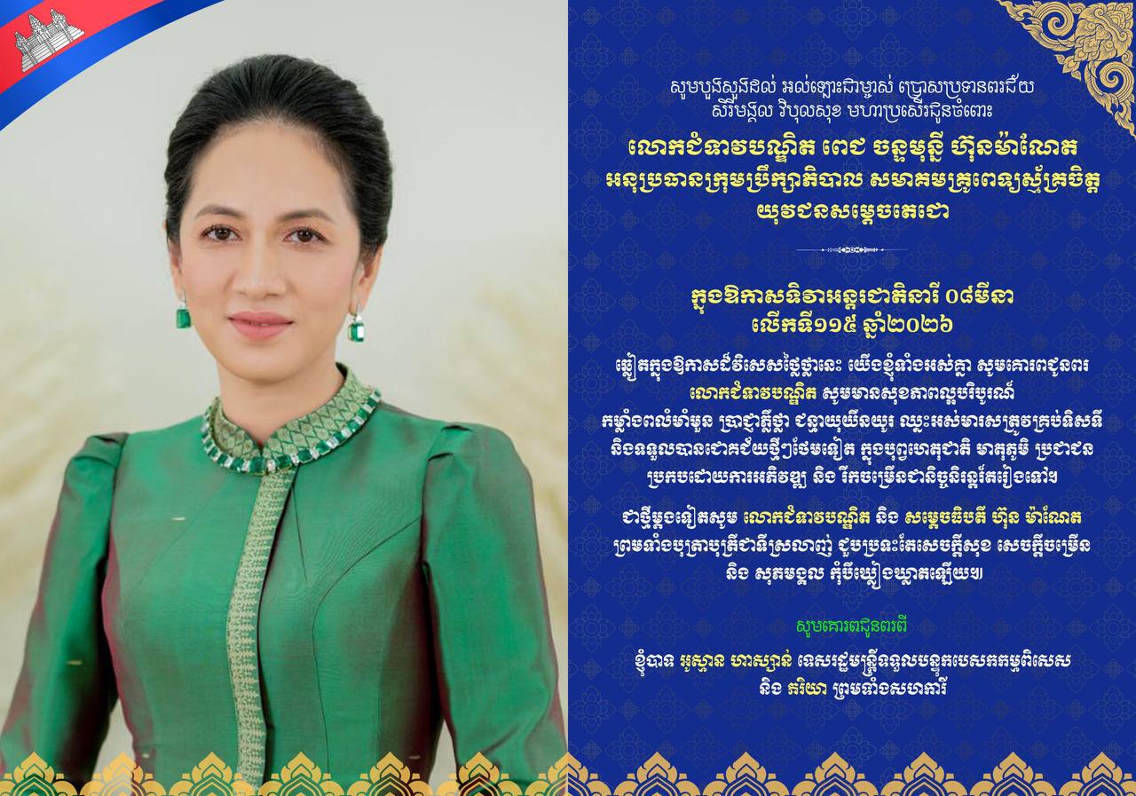 នៅក្នុងឱកាសអបអរសាទរខួបលើកទី១១៥ ទិវាអន្តរជាតិនារី ៨មីនា ឆ្នាំ២០២៦នេះ ខ្ញុំ និងភរិយា សូមបួងសួងពីអល់ឡោះជាម្ចាស់ មេត្តាប្រោសប្រទានពរជ័យបវរសួស្តី សិរីមង្គល វិបុលសុខមហា ប្រសើរជូនចំពោះ លោកជំទាវបណ្ឌិត សូមទទួលបាន នូវសុខភាពល្អបរិបូរណ៍ កម្លាំងមាំមួន អាយុយឺនយូរ បញ្ញាញាណវាងវៃ ដើម្បីរួមចំណែកជាមួយរាជរដ្ឋាភិបាល ក្នុងការអភិវឌ្ឍជាតិមាតុភូមិកម្ពុជាឱ្យកាន់តែរីកចម្រើនខ្លាំងក្លា និងសម្រេចបាននូវសមិទ្ធផលថ្មីៗបន្ថែមទៀត។