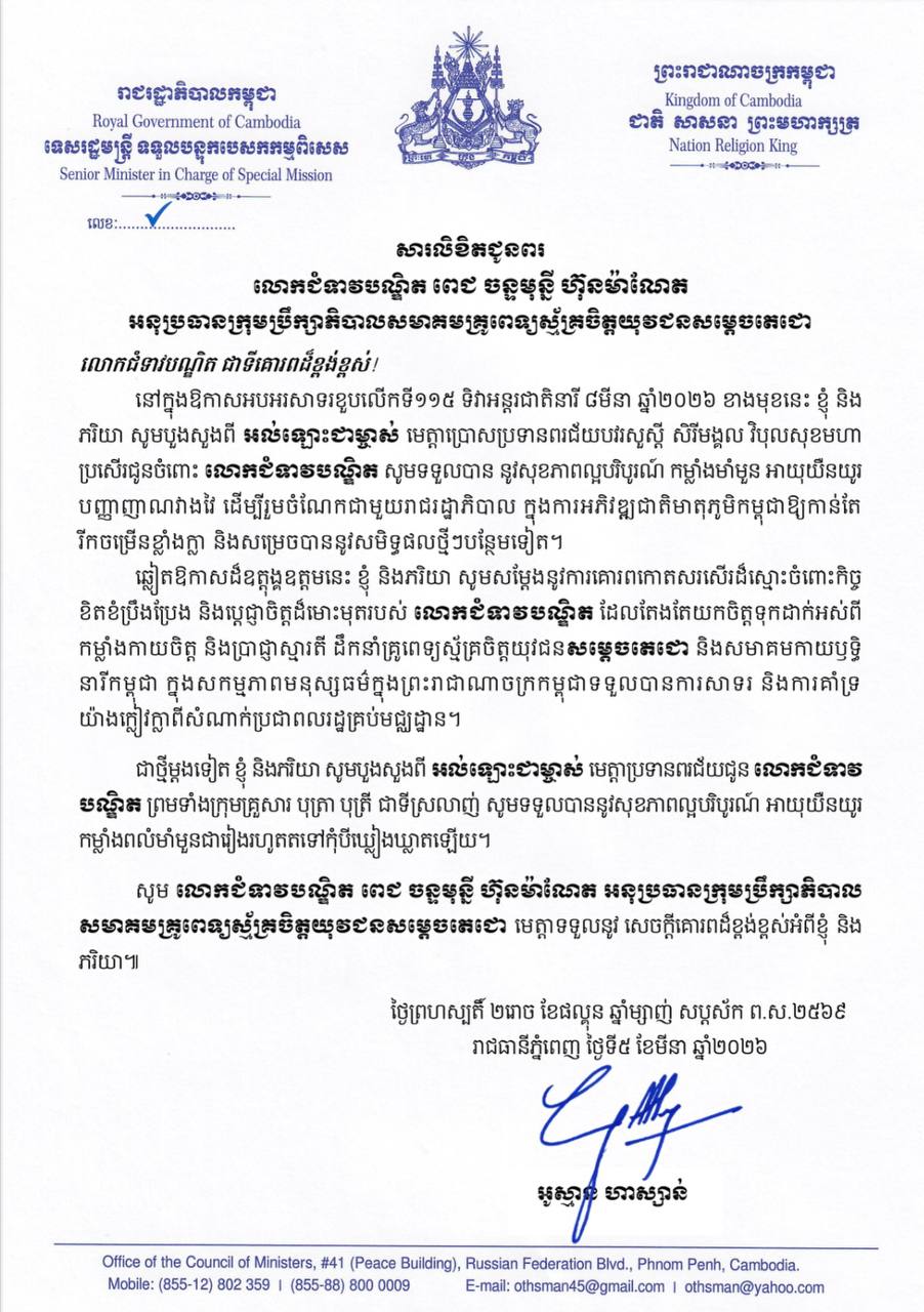 (ភ្នំពេញ)៖ ឯកឧត្តមបណ្ឌិត អូស្មាន ហាស្សាន់ ទេសរដ្ឋមន្ត្រីទទួលបន្ទុកបេសកកម្មពិសេស និងភរិយា បានផ្ញើសារលិខិតជូនពរ គោរពជូនលោកជំទាវបណ្ឌិត ពេជ ចន្ទមុន្នី ហ៊ុនម៉ាណែត អនុប្រធានអចិន្ត្រៃយ៍កាកបាទក្រហមកម្ពុជា និងជាអគ្គស្នងការសមាគមកាយឫទ្ធិនារីកម្ពុជា នៅក្នុងឱកាសដ៏មហានក្ខត្តឫក្ស ប្រកបដោយសិរីសួស្តី បវរថ្លៃថ្លាមហាប្រសើរនៃការរំលឹកខួបលើកទី១១៥ នៃទិវានារីអន្តរជាតិ ៨មីនា ឆ្នាំ២០២៦។