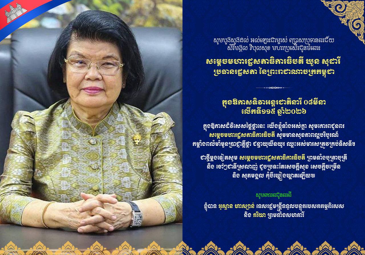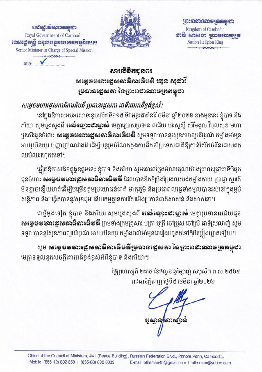 (ភ្នំពេញ)៖ ឯកឧត្តមបណ្ឌិត អូស្មាន ហាស្សាន់ ទេសរដ្ឋមន្ត្រីទទួលបន្ទុកបេសកកម្មពិសេស និងភរិយា បានផ្ញើសារលិខិតជូនពរ គោរពជូនសម្តេចមហារដ្ឋសភាធិការធិបតី ឃួន សុដារី ប្រធានរដ្ឋសភានៃព្រះរាជាណាចក្រកម្ពុជា នៅក្នុងឱកាសដ៏មហានក្ខត្តឫក្ស ប្រកបដោយសិរីសួស្តី បវរថ្លៃថ្លាមហាប្រសើរនៃការរំលឹកខួបលើកទី១១៥ នៃទិវានារីអន្តរជាតិ ៨មីនា ឆ្នាំ២០២៦។