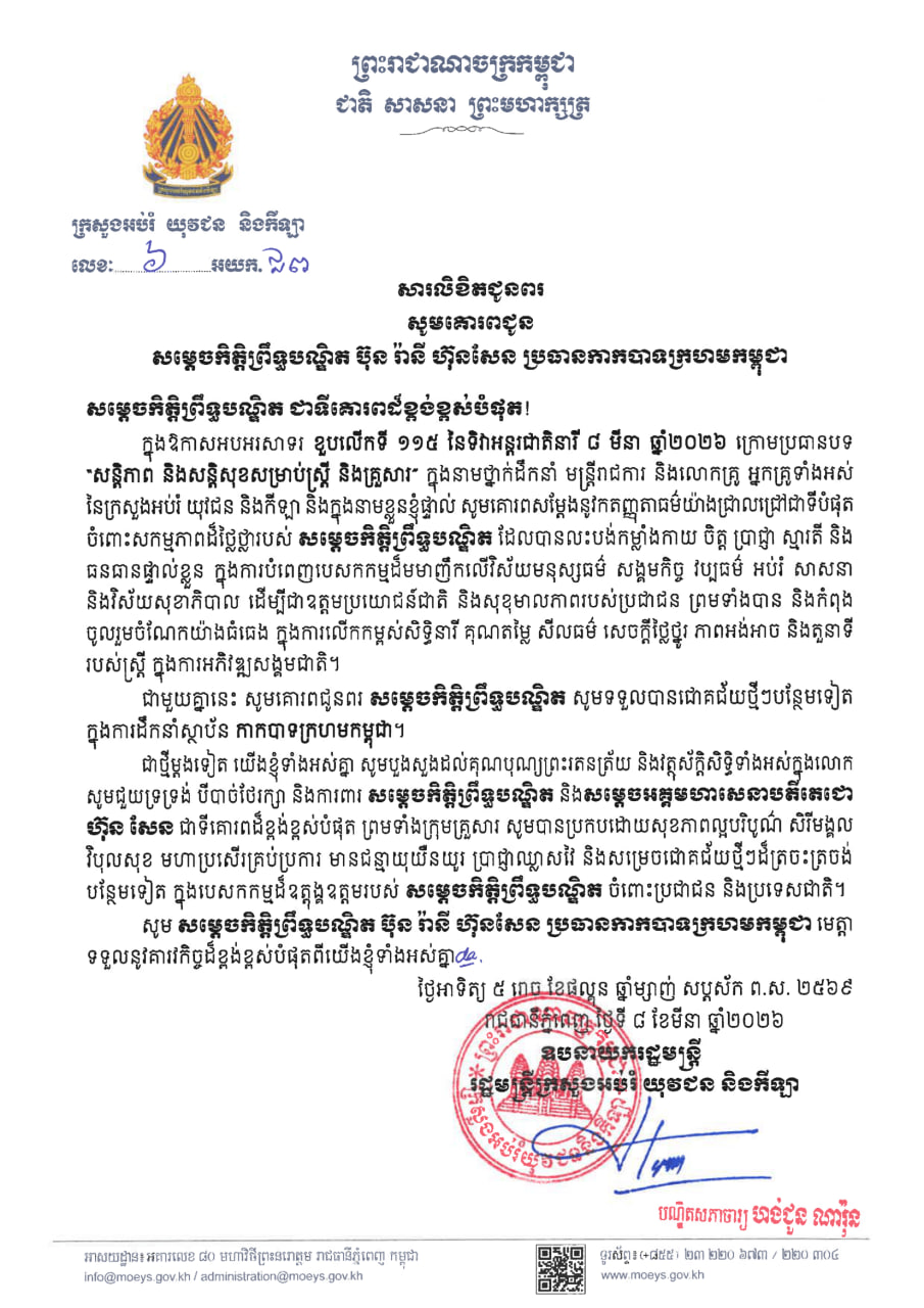 (ភ្នំពេញ)៖ ឯកឧត្តមបណ្ឌិតសភាចារ្យ ហង់ជួន ណារ៉ុន ឧបនាយករដ្ឋមន្រ្តី និងជារដ្ឋមន្ដ្រីក្រសួងអប់រំ យុវជន និងកីឡា និងមន្ដ្រីរាជការទាំងអស់ បានផ្ញើសារលិខិតជូនពរគោរពជូនសម្តេចកិត្តិព្រឹទ្ធបណ្ឌិត ប៊ុន រ៉ានី ហ៊ុន សែន ប្រធានកាកបាទក្រហមកម្ពុជា នៅក្នុងឱកាសដ៏មហានក្ខត្តឫក្ស ប្រកបដោយសិរីសួស្តី បវរថ្លៃថ្លាមហាប្រសើរនៃការរំលឹកខួបលើកទី១១៥ នៃទិវានារីអន្តរជាតិ ៨មីនា ឆ្នាំ២០២៦។
