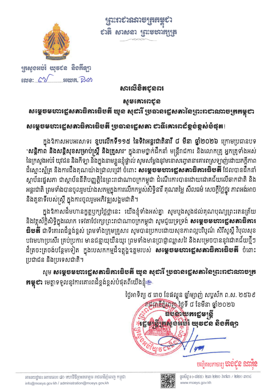 (ភ្នំពេញ)៖ ឯកឧត្តមបណ្ឌិតសភាចារ្យ ហង់ជួន ណារ៉ុន ឧបនាយករដ្ឋមន្រ្តី និងជារដ្ឋមន្ដ្រីក្រសួងអប់រំ យុវជន និងកីឡា និងមន្ដ្រីរាជការទាំងអស់ បានផ្ញើសារលិខិតជូនពរ គោរពជូនសម្តេចមហារដ្ឋសភាធិការធិបតី ឃួន សុដារី ប្រធានរដ្ឋសភានៃព្រះរាជាណាចក្រកម្ពុជា នៅក្នុងឱកាសដ៏មហានក្ខត្តឫក្ស ប្រកបដោយសិរីសួស្តី បវរថ្លៃថ្លាមហាប្រសើរនៃការរំលឹកខួបលើកទី១១៥ នៃទិវានារីអន្តរជាតិ ៨មីនា ឆ្នាំ២០២៦។
