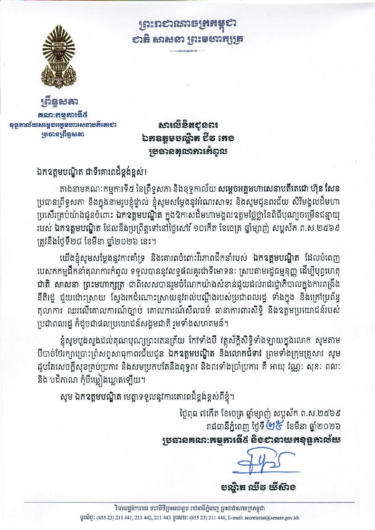 (ភ្នំពេញ)៖ ឯកឧត្តមបណ្ឌិត ឈីវ យីស៊ាង ប្រធានគណៈកម្មការទី៥ ព្រឹទ្ធសភា និងជានាយកខុទ្ទកាល័យ សម្តេចតេជោ ហ៊ុន សែន បានផ្ញើសារលិខិតជូនពរ ឯកឧត្តមបណ្ឌិត ជីវ កេង ប្រធានតុលាការកំពូល នៃព្រះរាជាណាចក្រកម្ពុជា ក្នុងឱកាសដ៏បវរសួស្តី សិរីមង្គលមហាប្រសើរ នៃពិធីចម្រើនជន្មាយុ ដែលប្រព្រឹត្តទៅនៅថ្ងៃសៅរ៍ ១០កើត ខែចេត្រ ឆ្នាំម្សាញ់ សប្តស័ក ពុទ្ធសករាជ ២៥៦៩ ត្រូវនឹងថ្ងៃទី២៨ ខែមីនា ឆ្នាំ២០២៦។