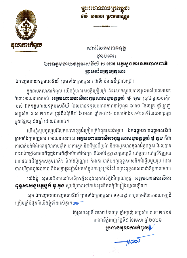 (ភ្នំពេញ)៖ ឯកឧត្ដម ជីវ កេង ប្រធានតុលាការកំពូល និងលោកជំទាវ ឆាយ ស៊ីណា ផ្ញើសាររំលែកទុក្ខជូន ឯកឧត្ដម នាយឧត្តមសេនីយ៍ ស ថេត អគ្គស្នងការនគរបាលជាតិ ចំពោះមរណភាព អគ្គមហាឧបាសិកាពុទ្ធសាសនូបត្ថម្ភក៍ ផូ ភួង ដែលត្រូវជាម្ដាយបង្កើតរបស់ឯកឧត្ដម បានទទួលមរណភាពនៅនៅថ្ងៃពុធ ៦រោច ខែចេត្រ ឆ្នាំម្សាញ់ សប្តស័ក ព.ស.២៥៦៩ ត្រូវនឹងថ្ងៃទី៨ ខែមេសា ឆ្នាំ២០២៦ វេលាម៉ោង០១៖១២នាទីរំលងអាធ្រាត្រ ក្នុងជន្មាយុ៩៥ឆ្នាំ ដោយជរាពាធ។
