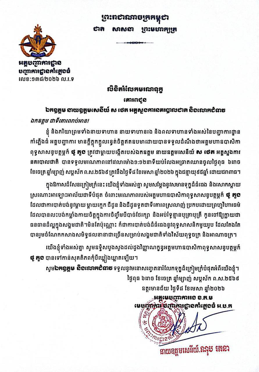 (ភ្នំពេញ)៖ នាយឧត្តមសេនីយ៍សាស្ត្រាចារ្យបណ្ឌិត ណុប រតនា អគ្គមេបញ្ជាការរងនៃកងយោធពលខេមរភូមិន្ទ និងជាមេបញ្ជាការបញ្ជាការដ្ឋានកាំភ្លើងធំអគ្គបញ្ជាការ ផ្ញើសាររំលែកទុក្ខជូន ឯកឧត្ដម នាយឧត្តមសេនីយ៍ ស ថេត អគ្គស្នងការនគរបាលជាតិ ចំពោះមរណភាព អគ្គមហាឧបាសិកាពុទ្ធសាសនូបត្ថម្ភក៍ ផូ ភួង ដែលត្រូវជាម្ដាយបង្កើតរបស់ឯកឧត្ដម បានទទួលមរណភាពនៅនៅថ្ងៃពុធ ៦រោច ខែចេត្រ ឆ្នាំម្សាញ់ សប្តស័ក ព.ស.២៥៦៩ ត្រូវនឹងថ្ងៃទី៨ ខែមេសា ឆ្នាំ២០២៦ វេលាម៉ោង០១៖១២នាទីរំលងអាធ្រាត្រ ក្នុងជន្មាយុ៩៥ឆ្នាំ ដោយជរាពាធ។